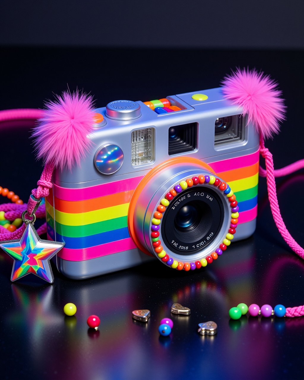 c4ndy, 현대적인 선명한 사진, 20살 사탕 레이버 친구 두 명, 어깨 너머로 뒷모습을 찍은 셀피, 야외 페스티벌 텐트 안, oversized 퍼 자켓을 열어 작은 반바지 위에 입고, 빨강-네온 노랑-주황-네온 녹색으로 층층이 쌓인 캔디 팔찌, 광택 나는 피부, 사탕 레이버 최고의 미학, 장난스러운 엉덩이 포커스, 밝은 낮빛