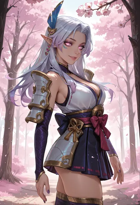 spiritblossomkayleil, 긴 머리, 그라데이션 머리, 빛나는 눈, 깃털 머리 장식, 회색 머리, 흰 머리, 보라색 머리, 뾰족한 귀, 분홍색 눈, 갈라진 앞머리, 얼굴 문신, 메이크업, 분홍색 입술, 귀걸이, 하트 귀걸이, 동공 없음, 다색 머리, 치마, 큰 가슴, 주름 치마, 어깨 노출, 소데, 분리된 소매, 일본 복장, 젯타이 리ョ우키, 발가락 없는 양말, 어깨 갑옷, 보라색 손톱, 허벅지 긴 양말, 짧은 키모노, 리본, bows, 갑옷, 일본 갑옷, 소매 없는 키모노,