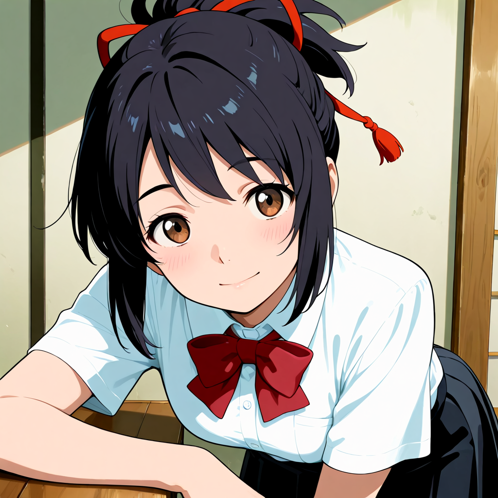 mitsuhayl, brown eyes, black hair, hair ribbon, red ribbon, white shirt, short sleeves, black skirt, red bowtie, tied hair,