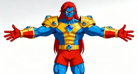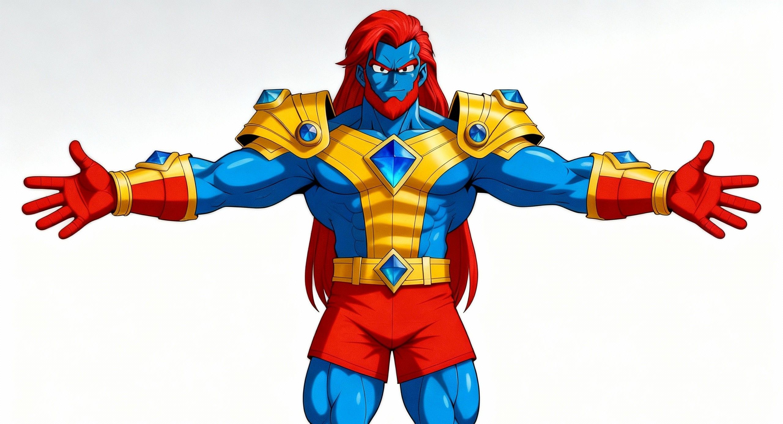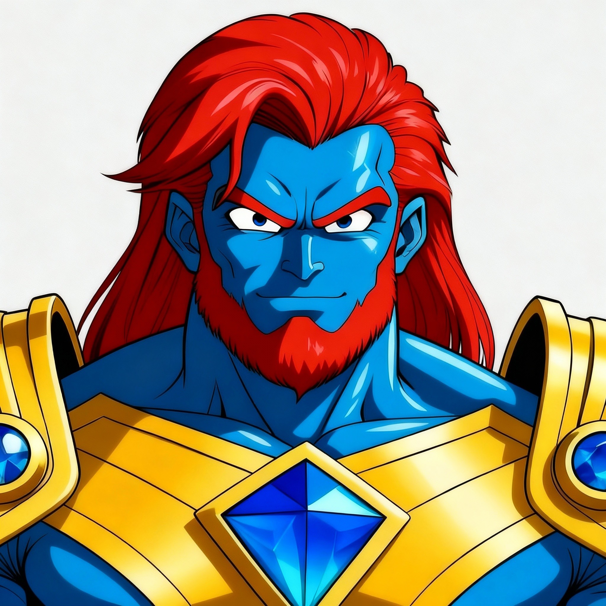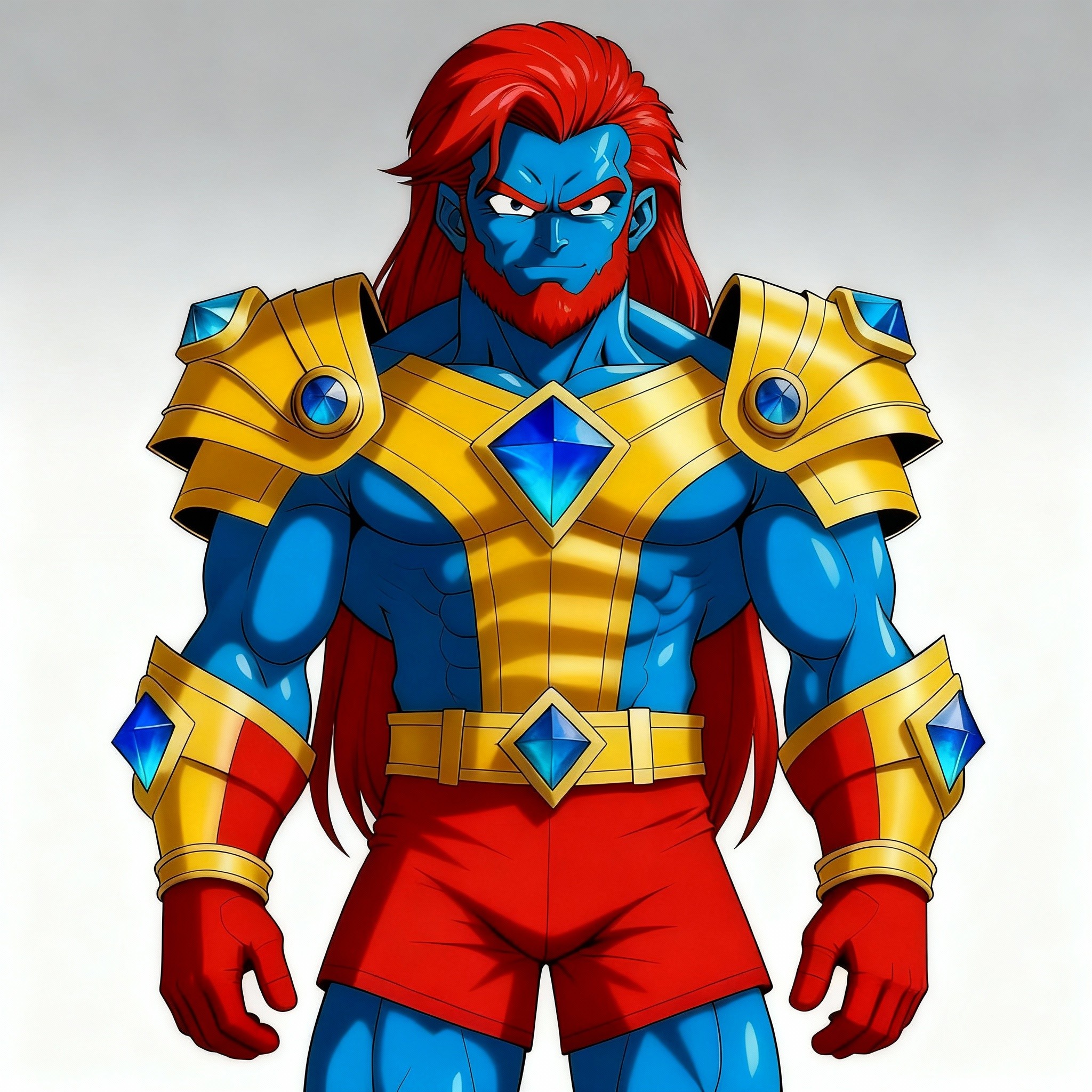 snapperzaff, tmsnapperzaff, snapperzafftm, 男性キャラクター、非常に筋肉質な体、背の高い人間型、全身、立位、正面ビュー、中立的な姿勢、アニメキャラクター、ドラゴンボール風アニメスタイル、クリーンな線画、滑らかなアニメシェーディング、青い肌、腰より長い赤髪、あごラインに沿った濃いひげ、上唇は清潔、鋭い眉、人間の耳、金色の滑らかなプレートアーマー、T字型胸部プレート、二重層肩甲部、埋め込まれた宝石、大型ダイヤモンド、ベルト、ショートパンツ、膝ガードとすねアーマー付きの脚部アーマー、ブーツ、対称的なアーマーデザイン