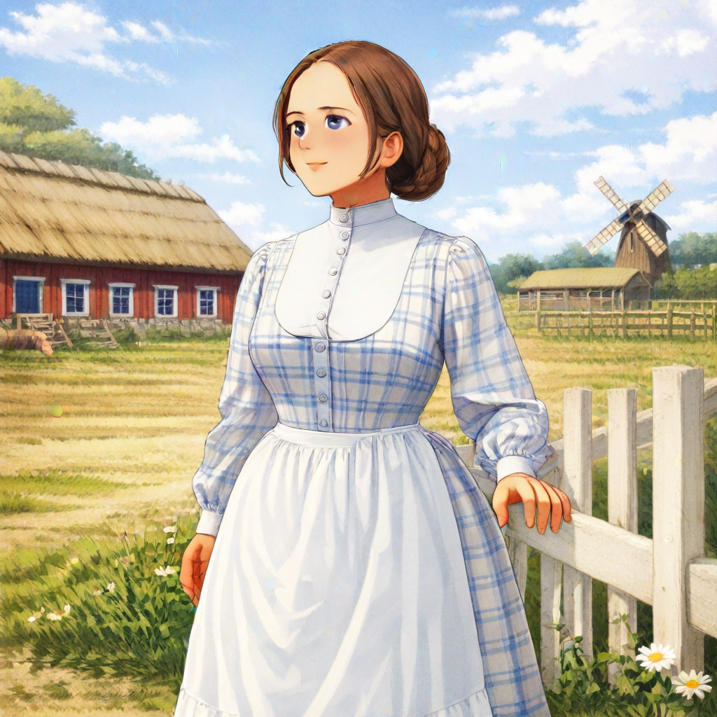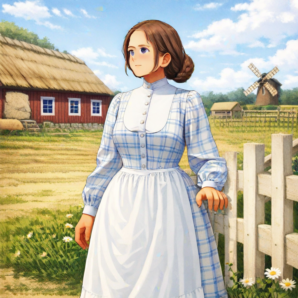 | 학습된 단어 | swedish_mistress1900, adult swedish farm mistress, early 1900s rural sweden, light blue and white plaid long dress, high collar white bib, buttoned bodice, long puffed sleeves, fitted waist, white apron worn over the skirt, waist-tied apron, brown hair in a low bun,복사됨! |