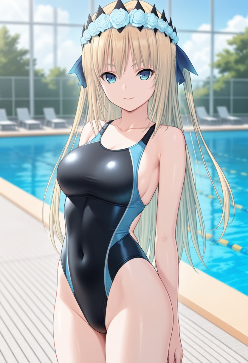 blue eyes, blonde hair, long hair, two side up, head wreath, hair ribbon, blue ribbon