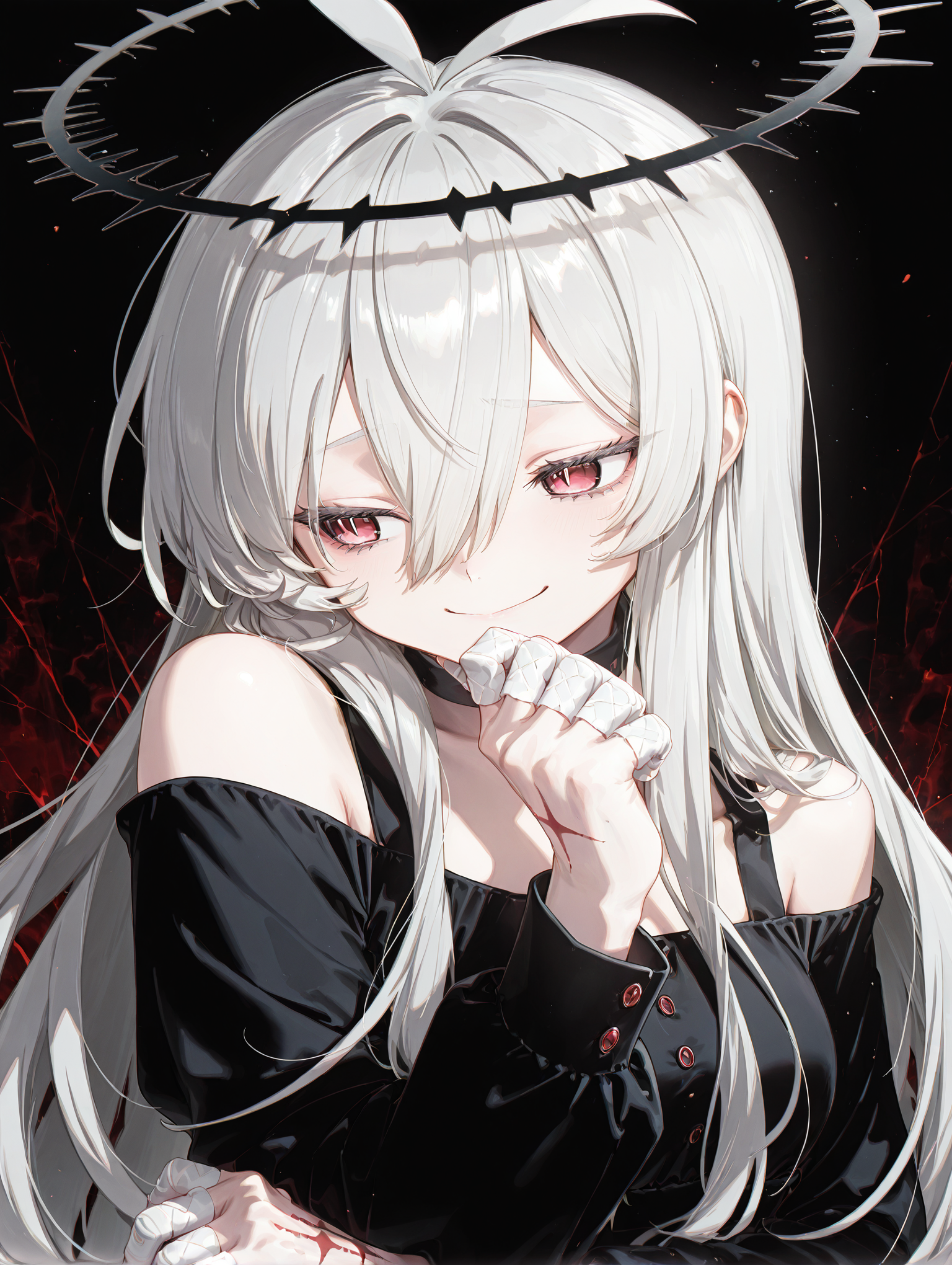 GekiUta, 1girl, 긴 머리, 눈 사이의 긴 머리카락, 검은 하늘, 날카로운 이빨, 안테나 머리카락