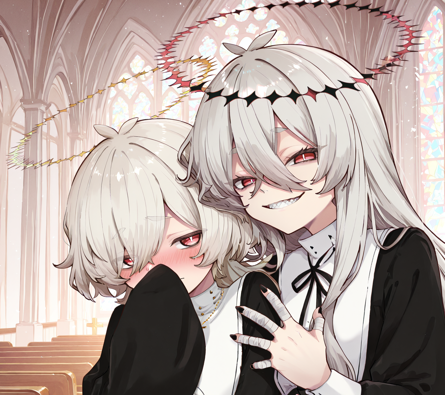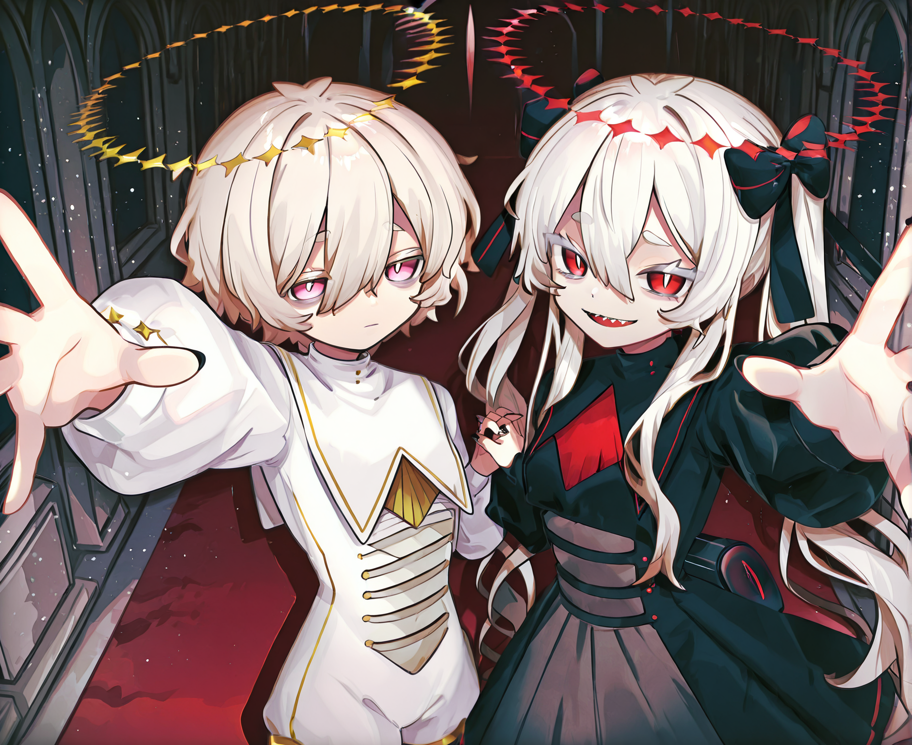 GekiVoca, 1girl, 긴 머리, 트윈테일, 빨간 하늘, 날카로운 이빨, 안테나 머리카락