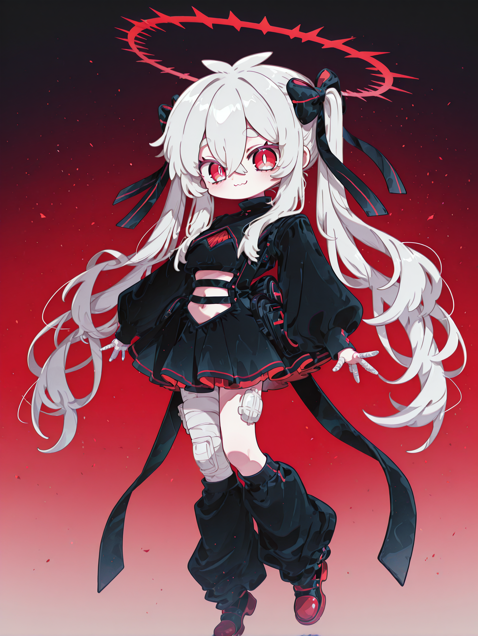 검은 빨간 드레스, 머리 리본, 뒤 리본, 복부 노출, 검은 빨간 신발, 날카로운 검은 손톱, 손 문신, 붕대 감긴 손가락, 붕대 감긴 다리, 레그 워머