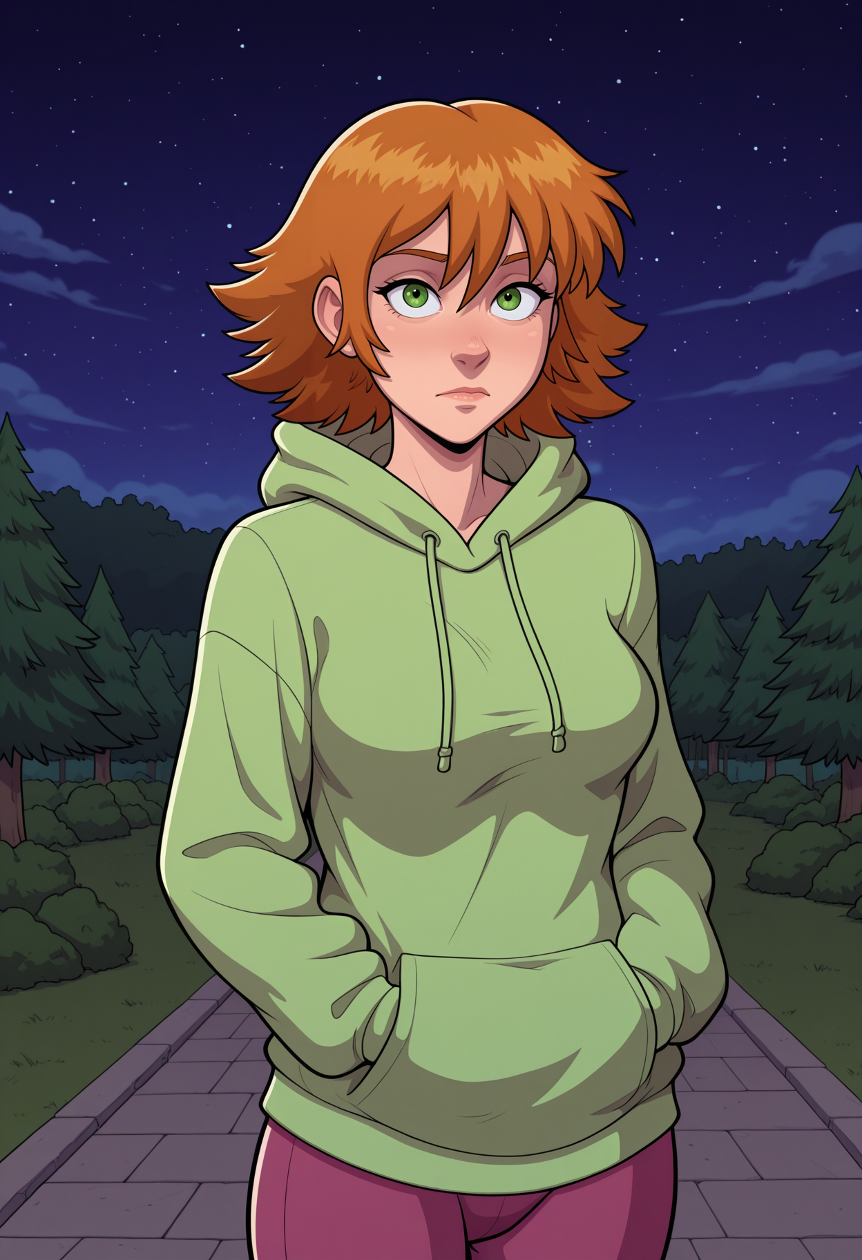 1girl, solo, green eyes, brown hair, orange hair, medium hair, hair between eyes, flipped hair, breasts, medium breasts,