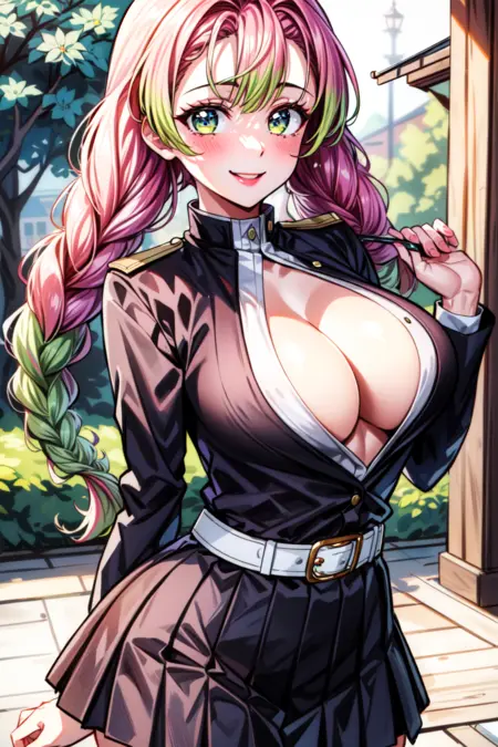 MitsuriKanroji_NDV, 1girl, multicolored hair, pink-green hair, large breasts, twin braids, red eyes, demon slayer uniform, green thighhighs, haori, open clothes
