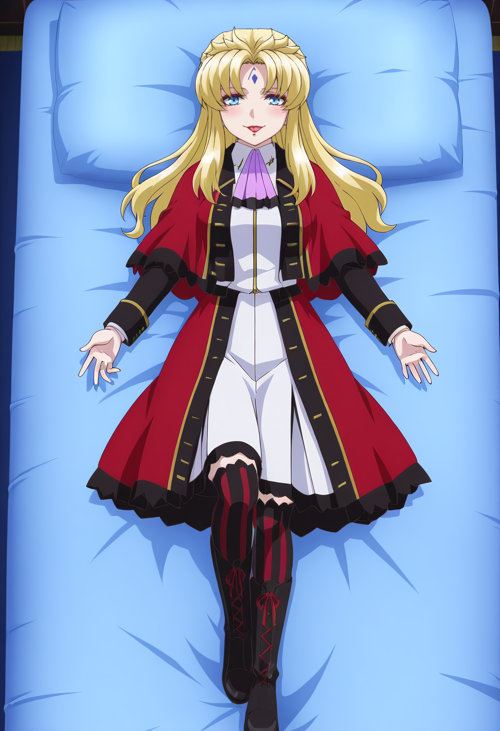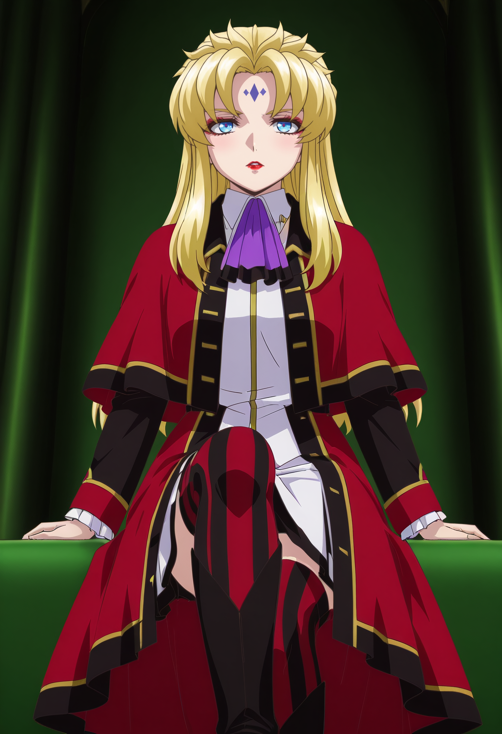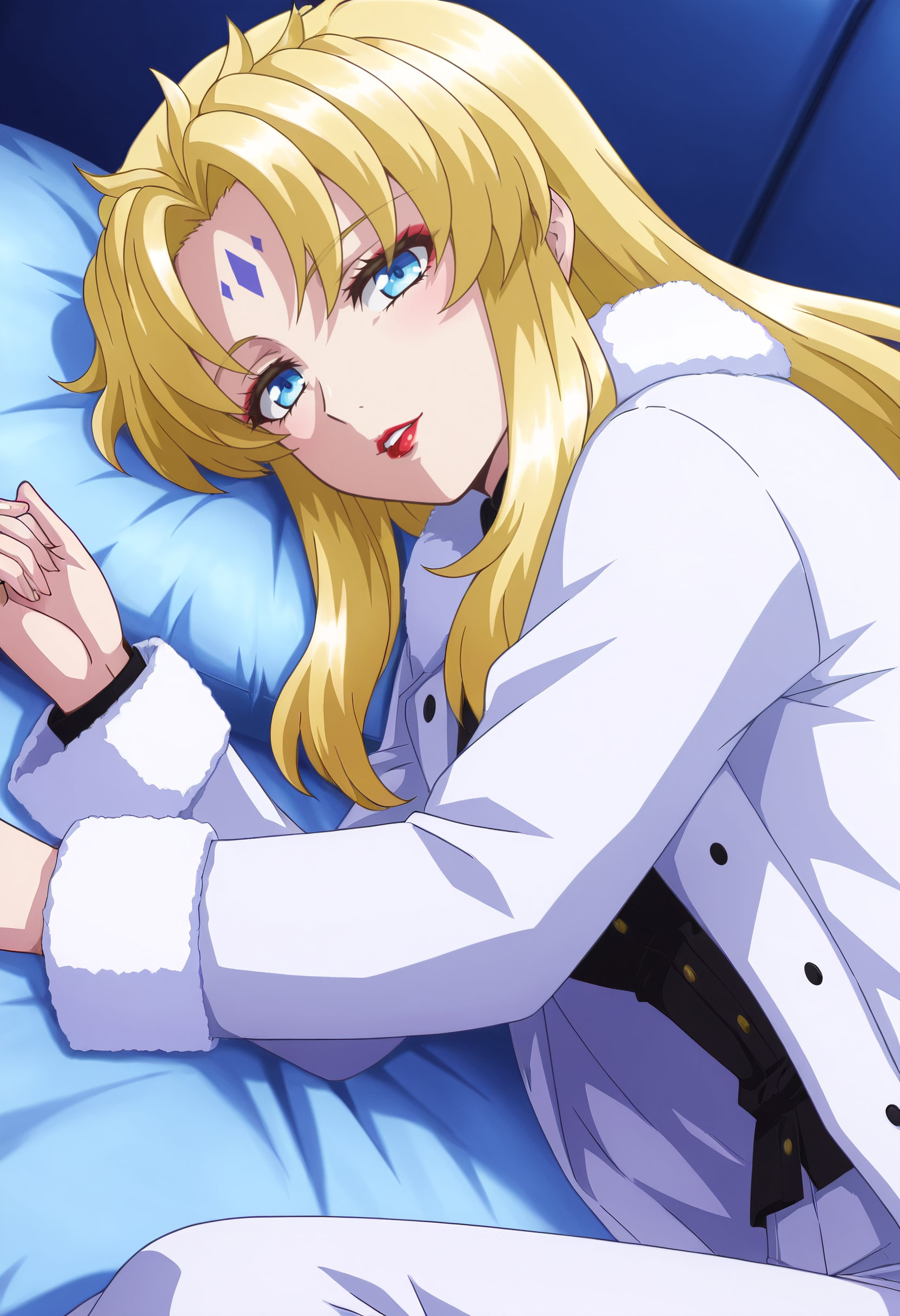 KSGAura、金髪、ロングヘア、青い目、顔の模様、前髪、分け目のある前髪、リップスティック、メイク、額の模様、赤い唇、