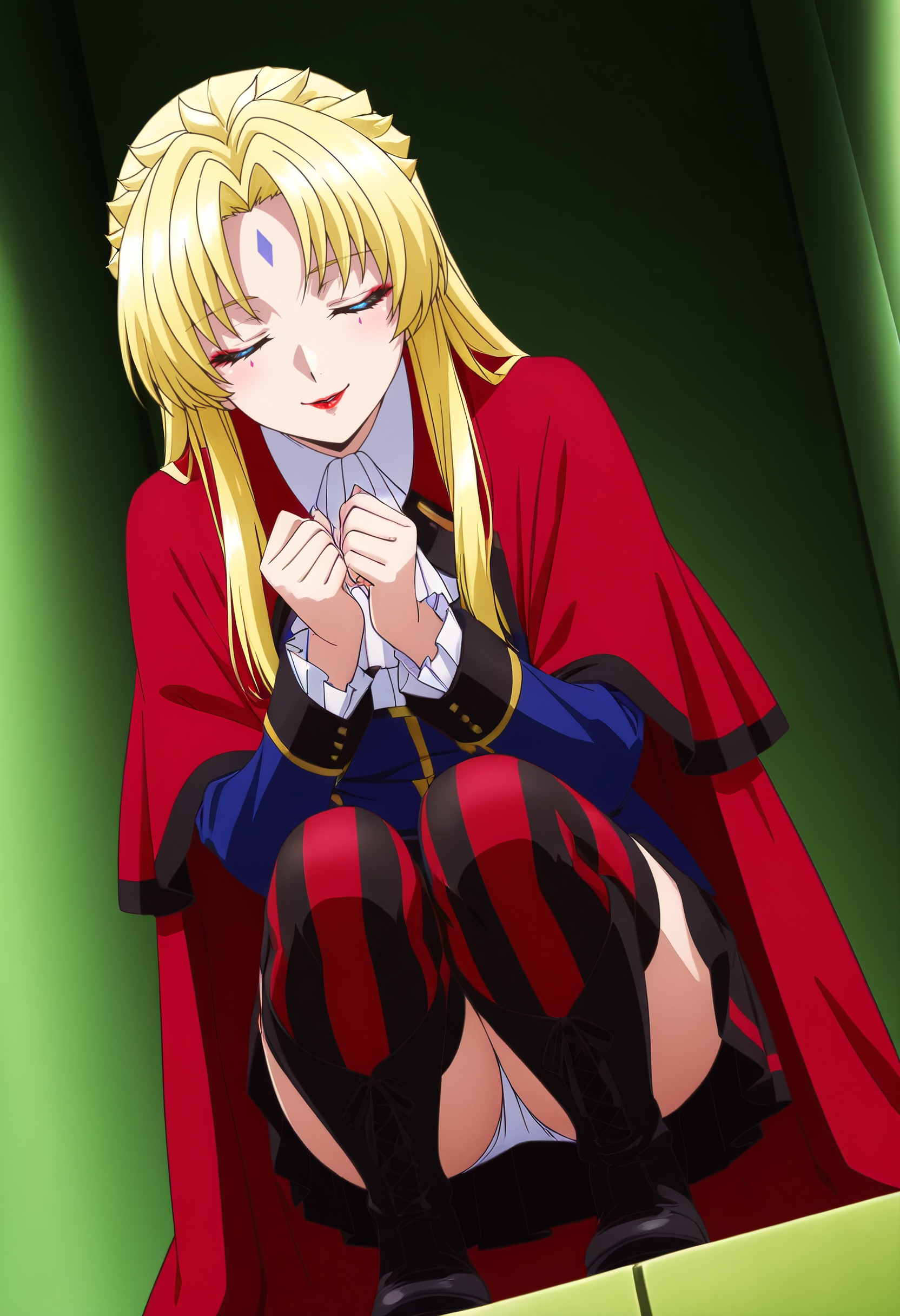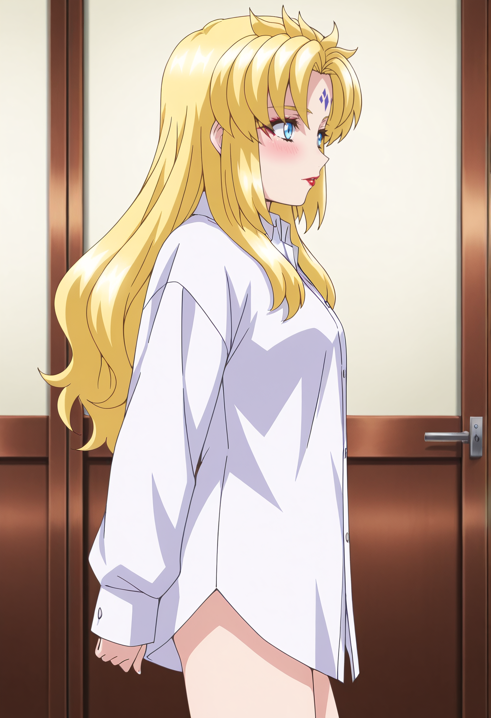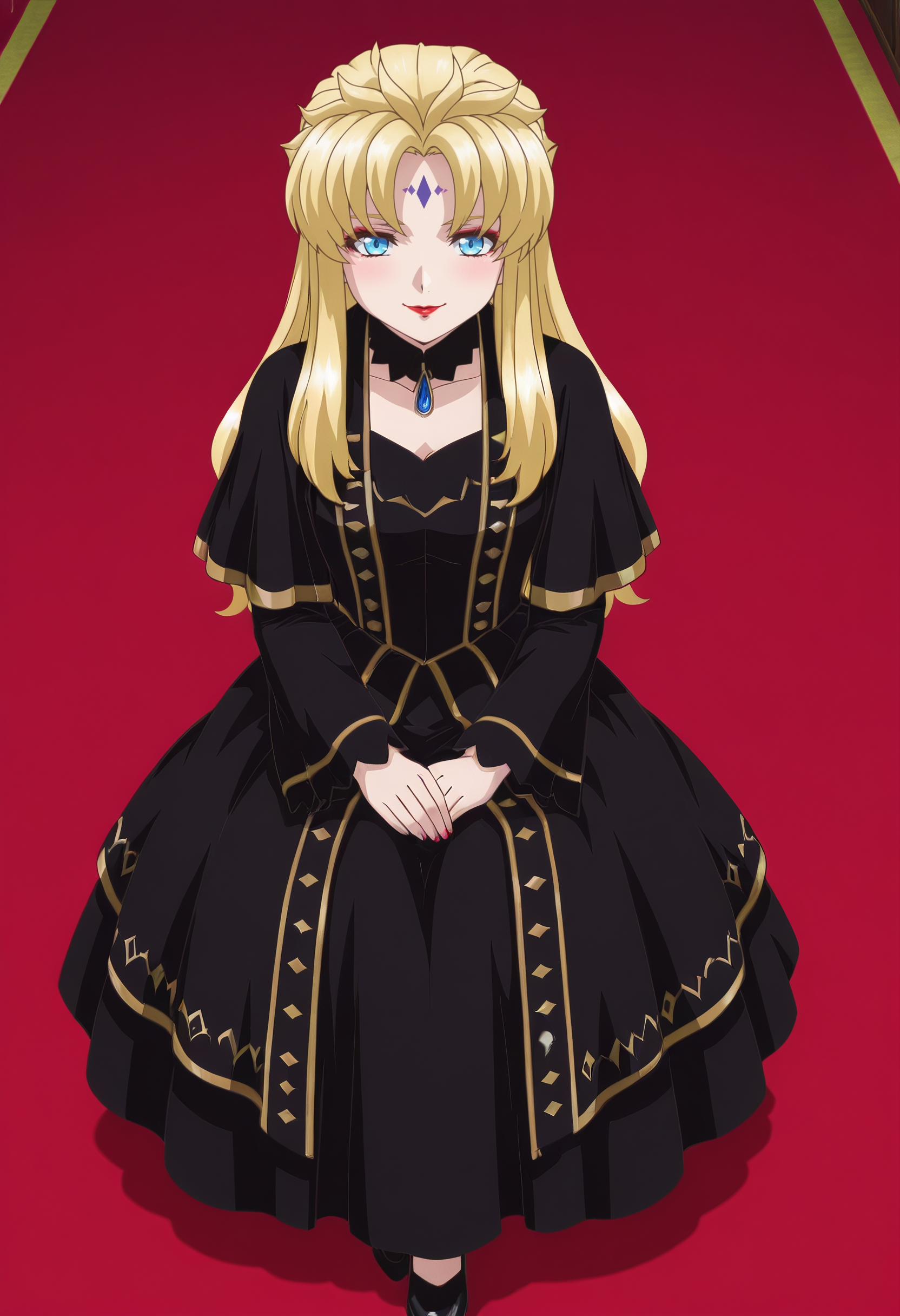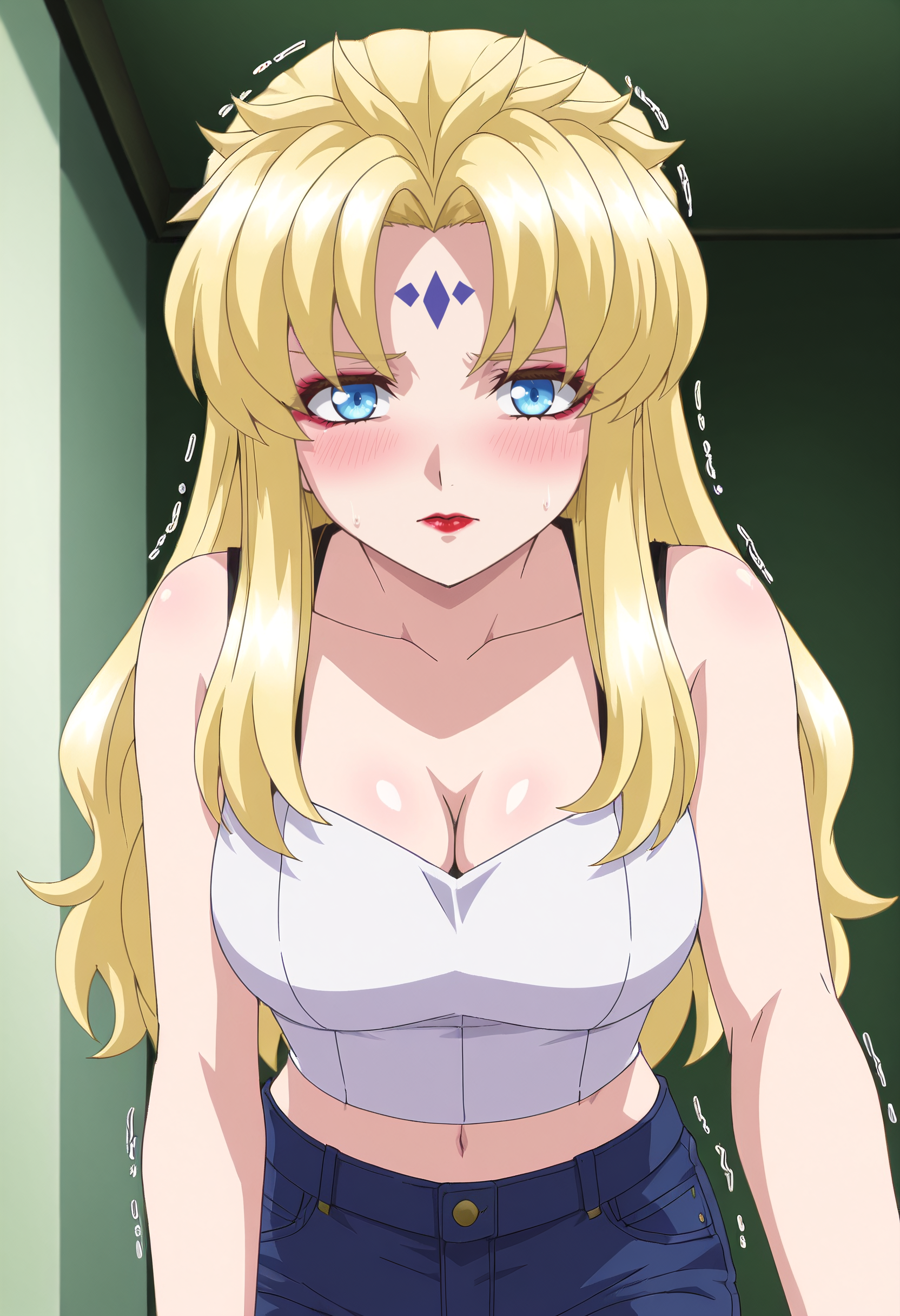 KSGAura、金髪、ロングヘア、青い目、顔の模様、前髪、分け目のある前髪、リップスティック、メイク、額の模様、赤い唇、
