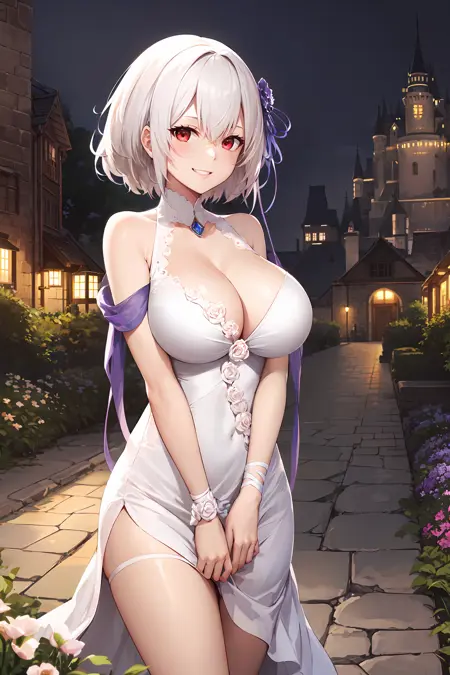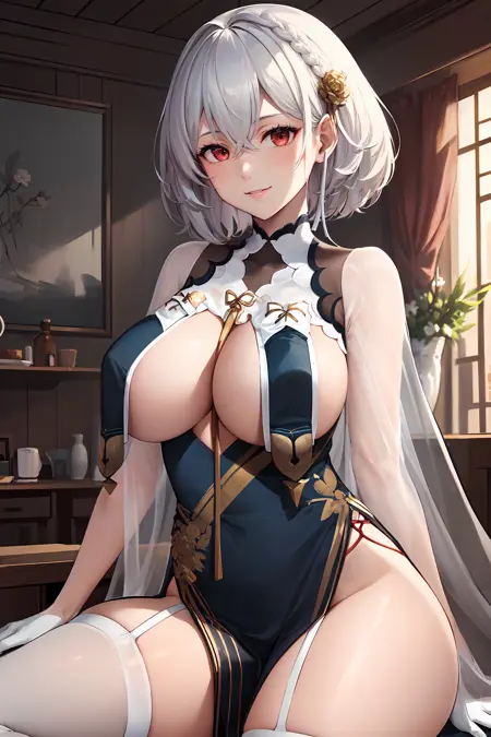 복장 4: 옆 머리 땋기, 머리 장식, 중국 복장, 회색 드레스, 가슴 커튼, 골반 커튼, 게터 스트랩, 투명, 흰색 허벅지 양말, 흰색 장갑