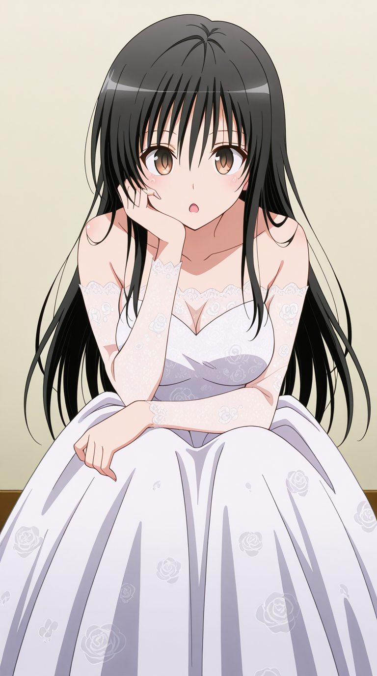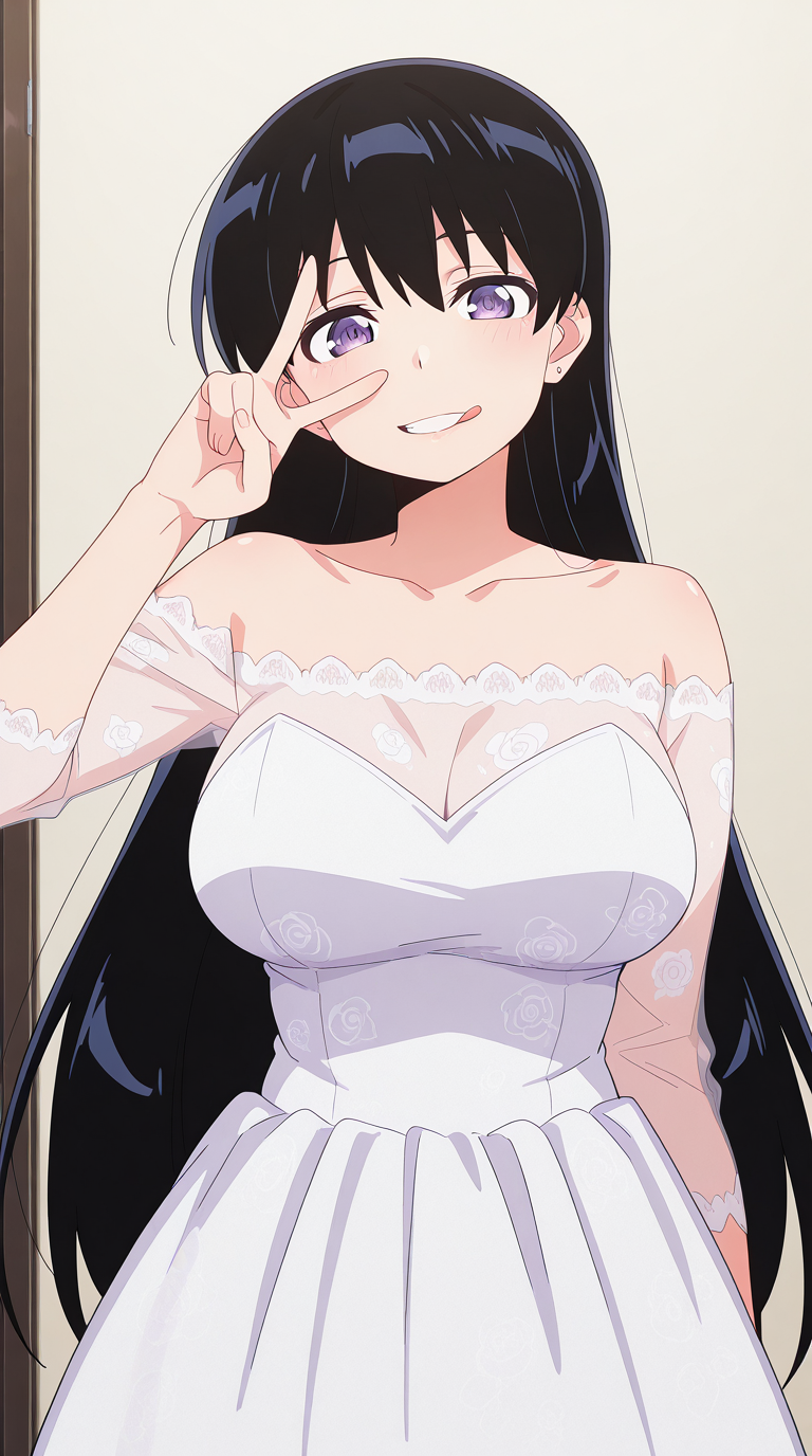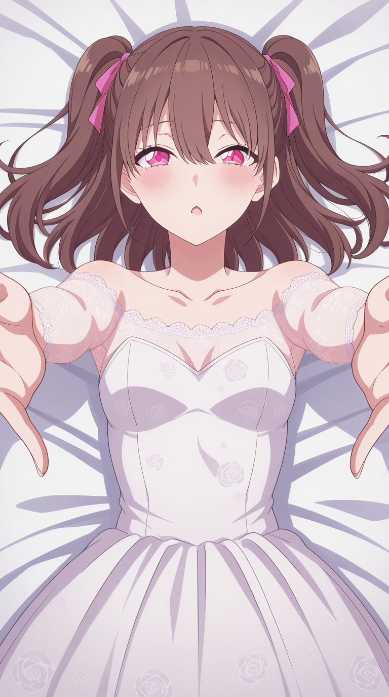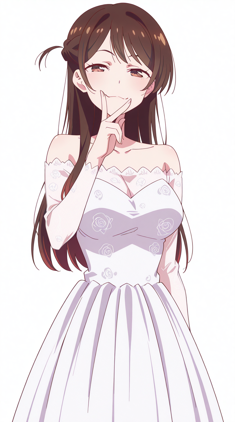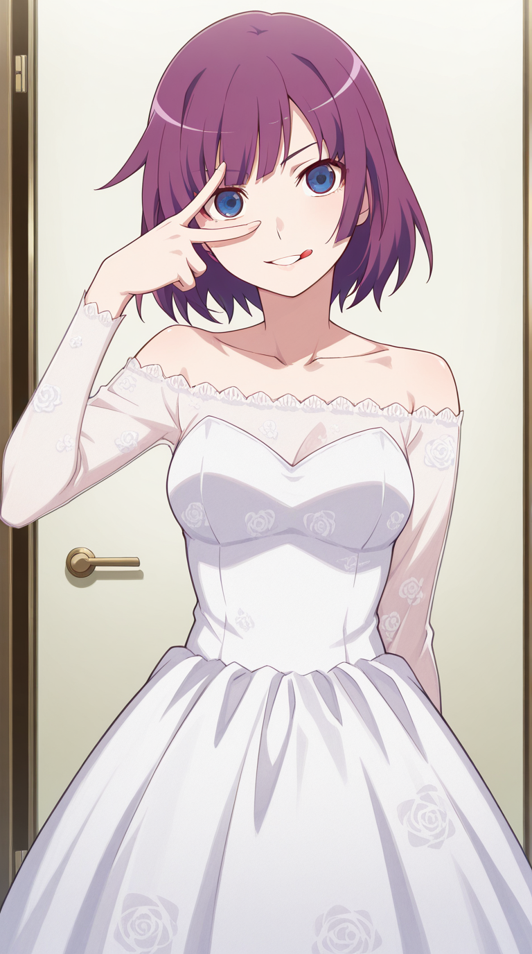 lora:nino-nakano-wedding-dress-illustriousxl-lora-nochekaiser:1, ninonakanoweddingdress, solo, dress, bare shoulders, collarbone, white dress, lace, wedding dress, off-shoulder dress, off shoulder, lace trim, floral print