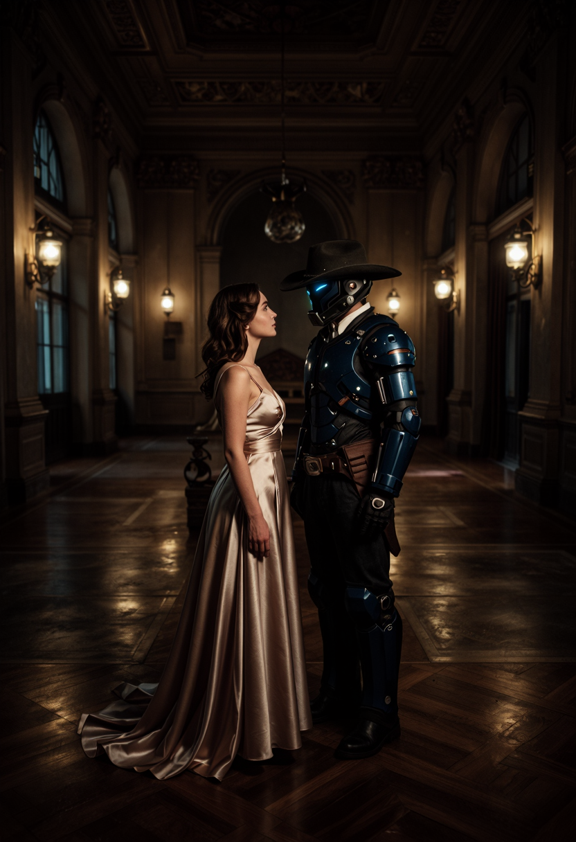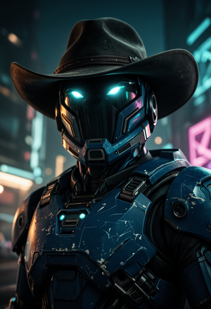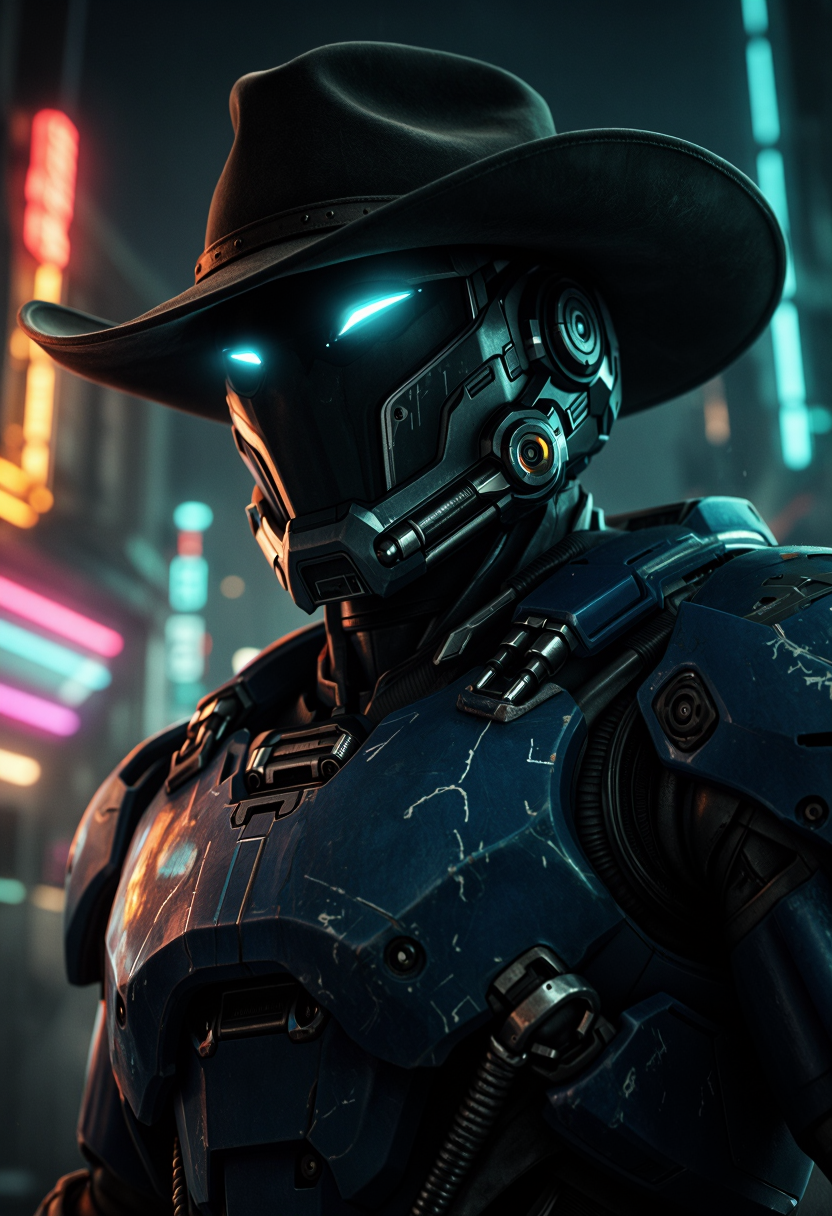 cyberpunk gunslinger, cowboy hat, futuristic armor, glowing blue LED eyes, heavy powered armor, gunslinger posture, massive colt