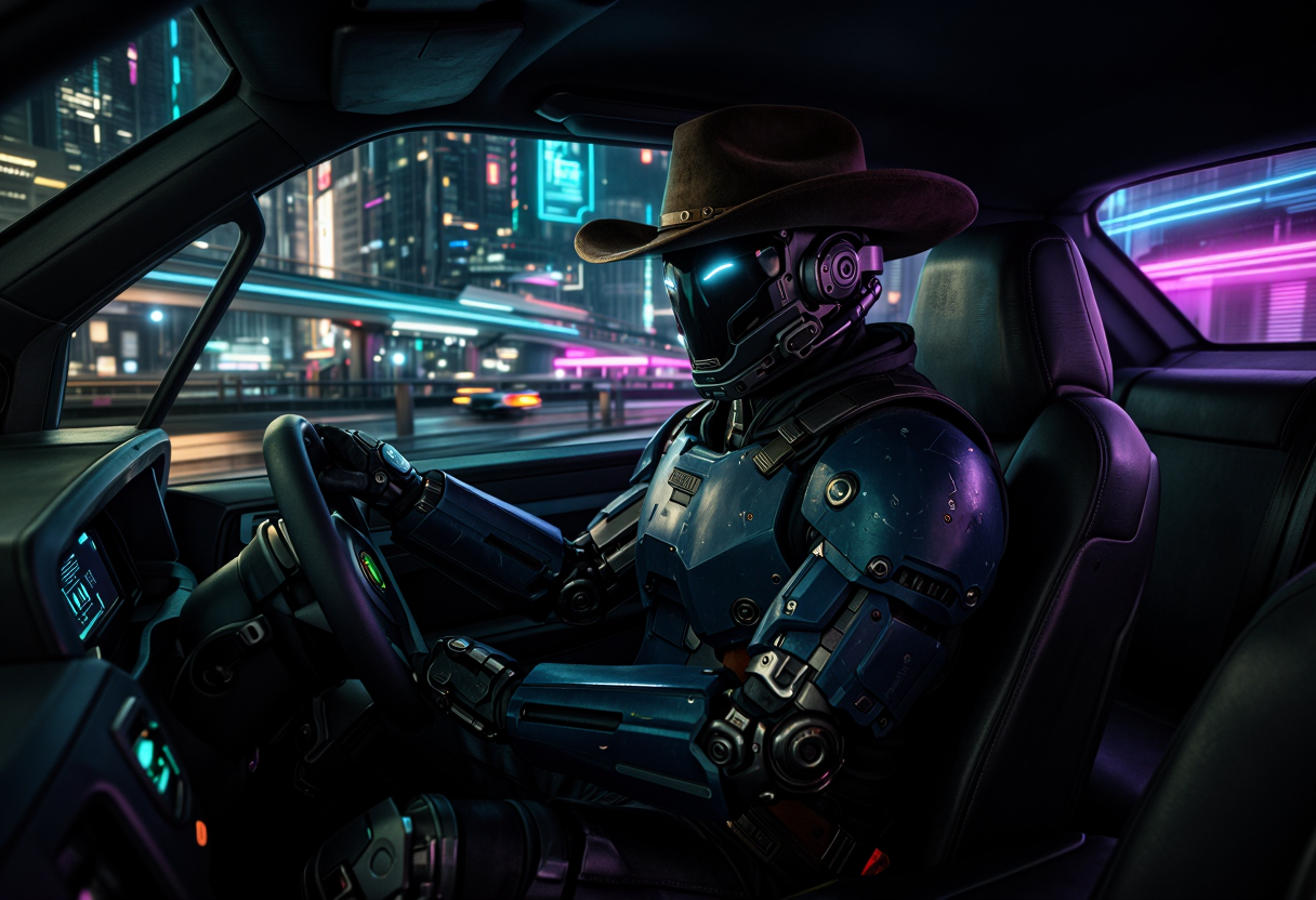 サイバーボブの核となるのは、対比によって定義された強烈で明確な存在感です。濃い青のパワードアーマー、広い縁のカウボーイハット、完全に覆われたハイテクヘルメットが組み合わさったシルエットは、どんな場所でも即座にガンスリンガーであると読み取られます。暗いビューワーの奥で輝く青いLEDの目が主な焦点となり、表情に頼らずに冷静な制御力、警戒心、潜在的な脅威を伝達します。
