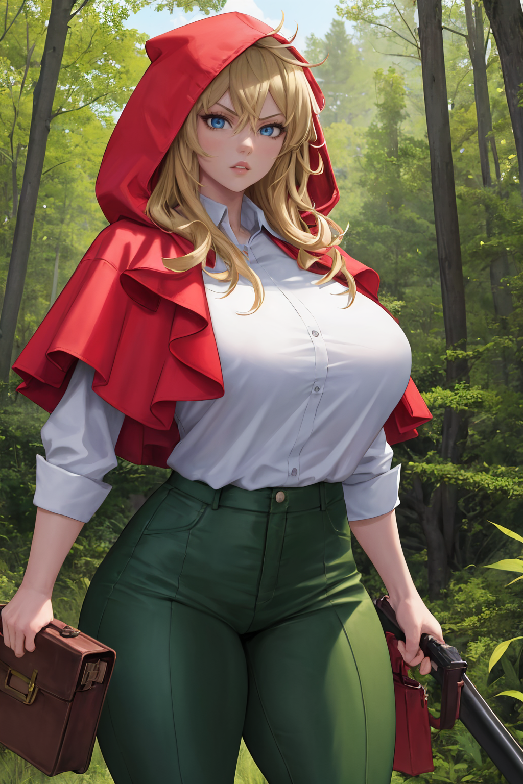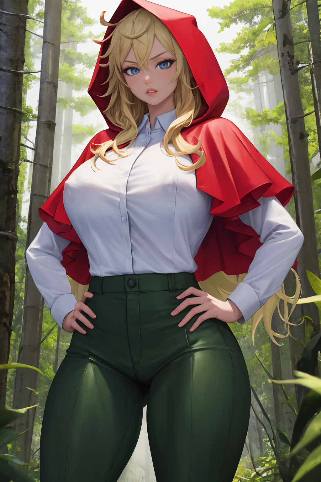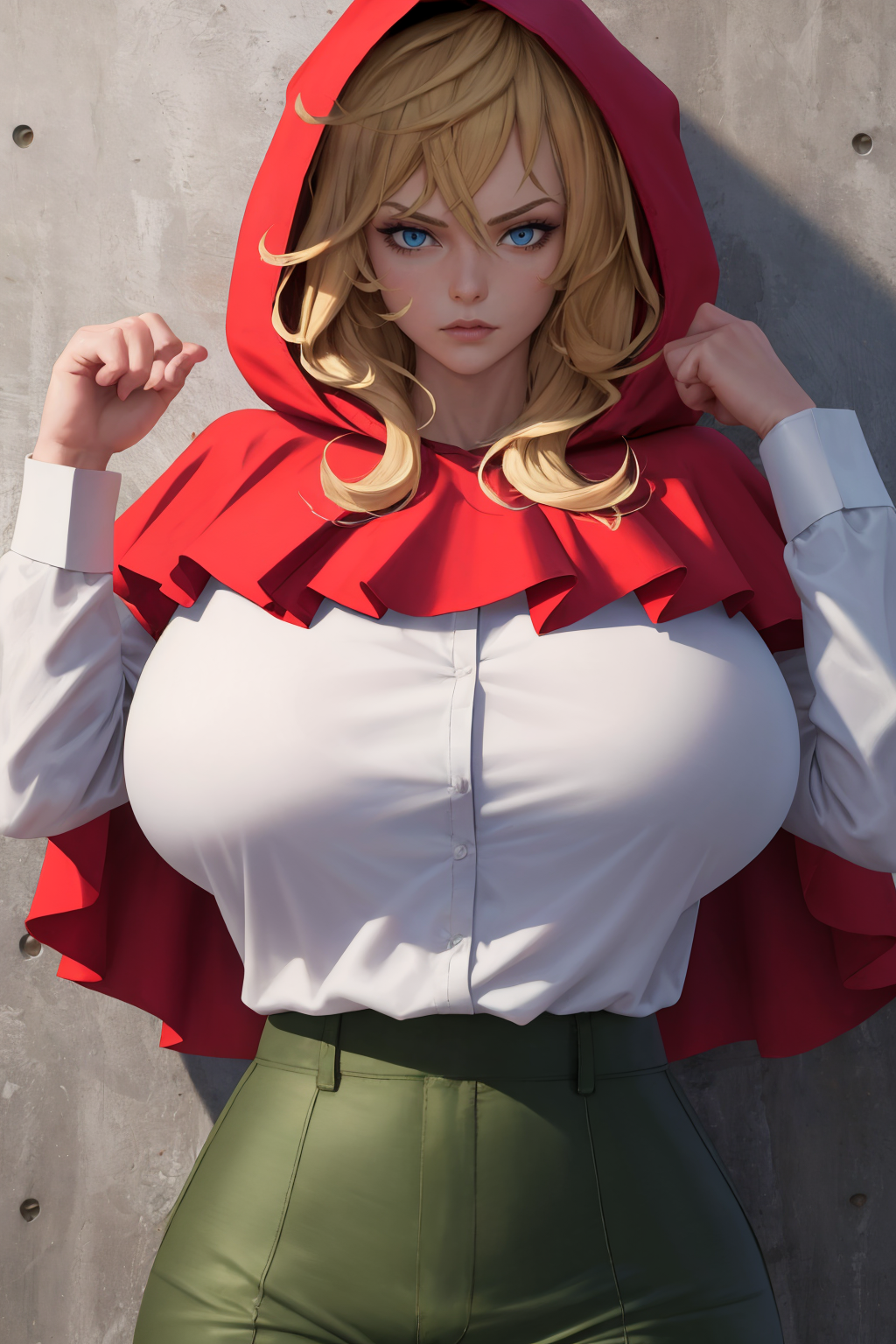 grimm, blue eyes, red hood, hood up, red capelet, white shirt, shirt tucked in, green pants, thigh strap, huge breasts, muscular female