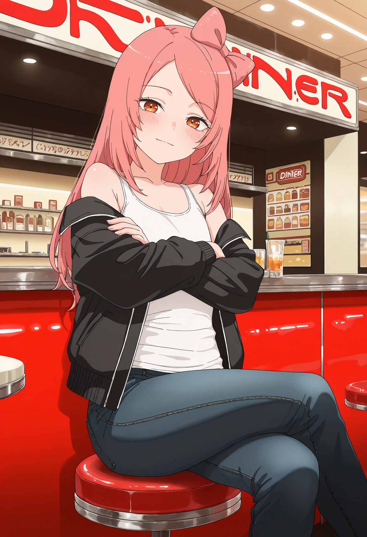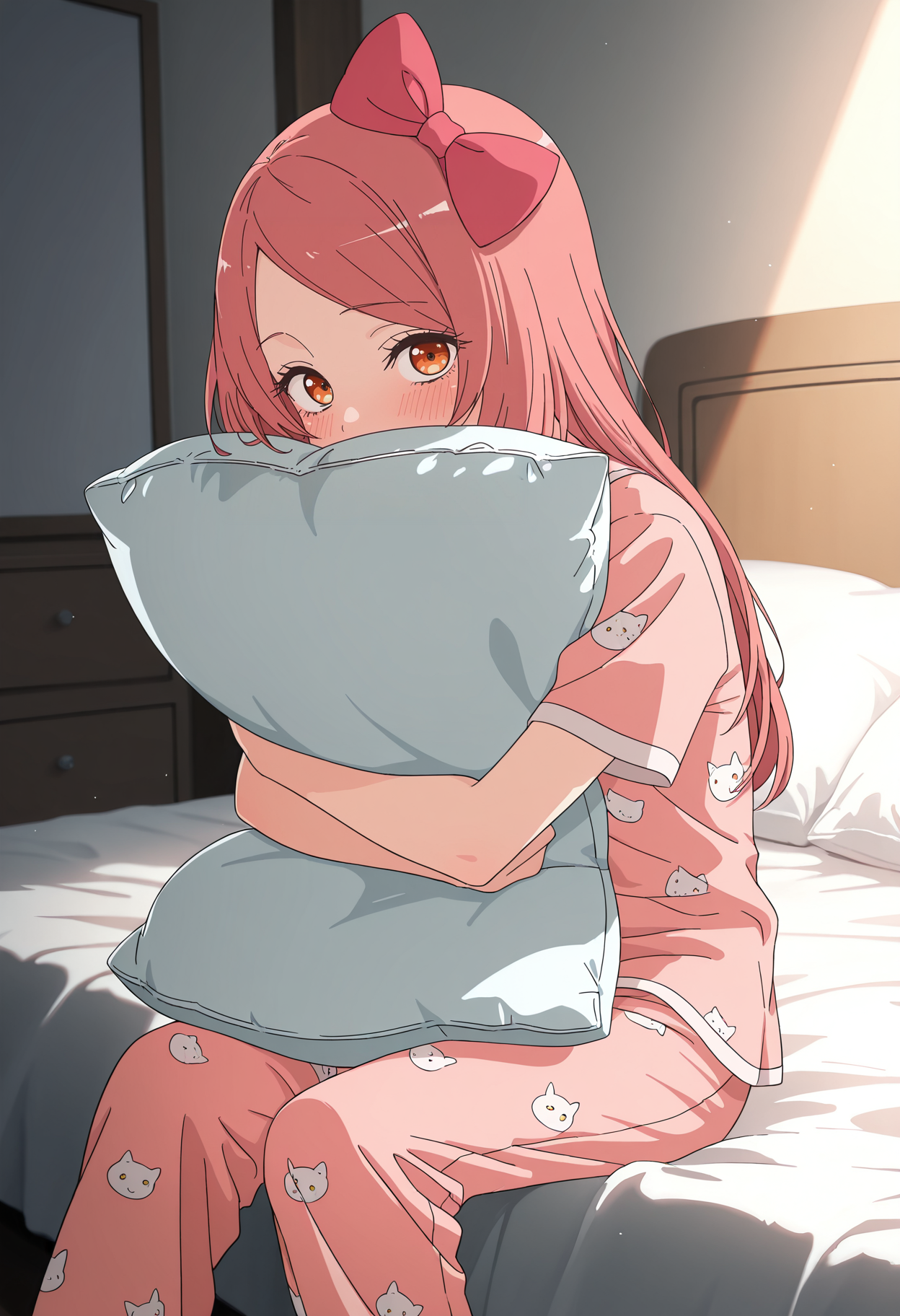 KJOsubaru, dark pink hair, amber eyes, long hair, hair bow, pink lipstick,