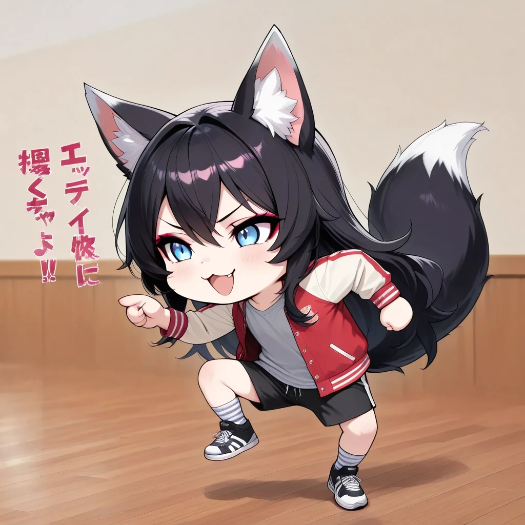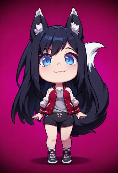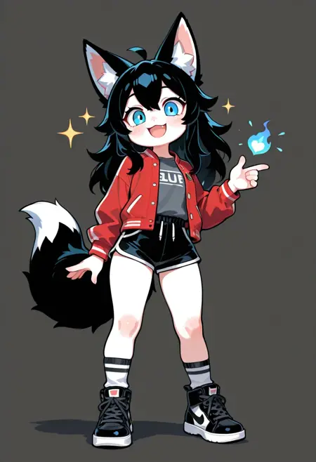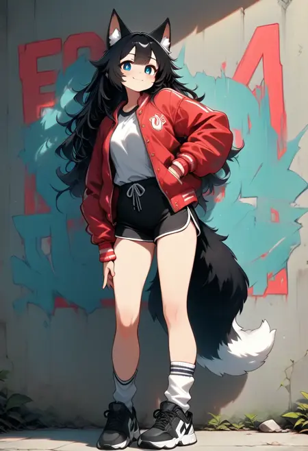 (마스터피스, 최고 품질:1.2), 1소녀, 솔로, Rubyz, 반인간, 늑대 소녀, 검은 머리, 긴 머리, 파란 눈, 여우 귀, 흰 끝이 있는 여우 귀, 티셔츠, 회색 티셔츠, 반바지, 검은 반바지, 재킷, 바르시티 재킷, 빨간 재킷, 줄무늬 팔목이 있는 바르시티 재킷, 푹신한 꼬리, 푹신한 꼬리 검은색에 흰 끝, 양말, 줄무늬 양말, 스니커즈, 검은 스니커즈, 하이탑 스니커즈,