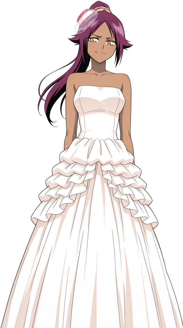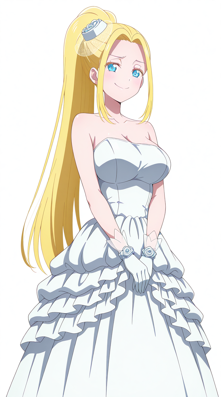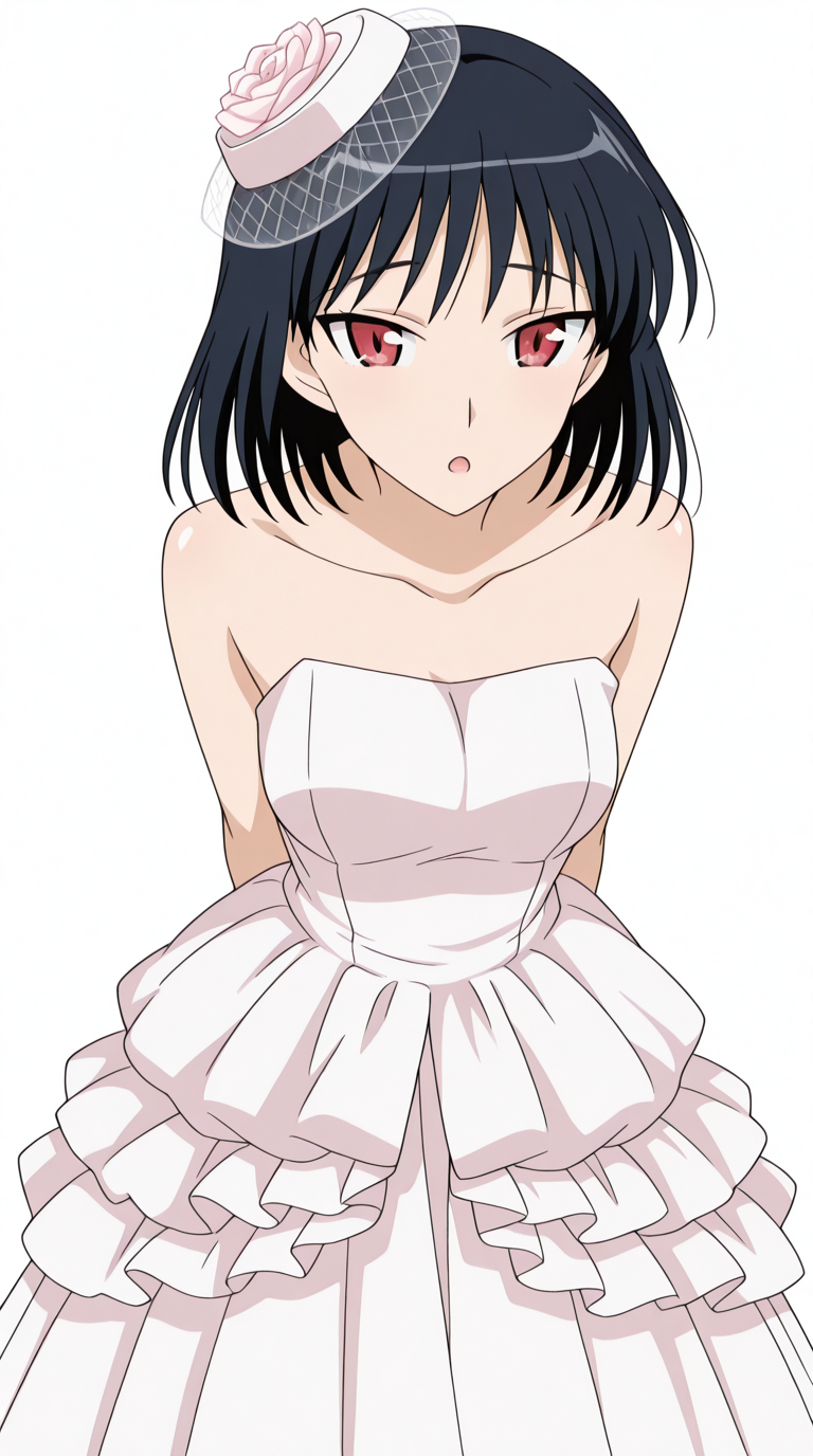 lora:itsuki-nakano-wedding-dress-illustriousxl-lora-nochekaiser:1, itsukinakanoweddingdress, solo, dress, hat, bare shoulders, collarbone, white dress, strapless, frilled dress, veil, strapless dress, wedding dress, bridal veil, bride, flower, see-through, rose,