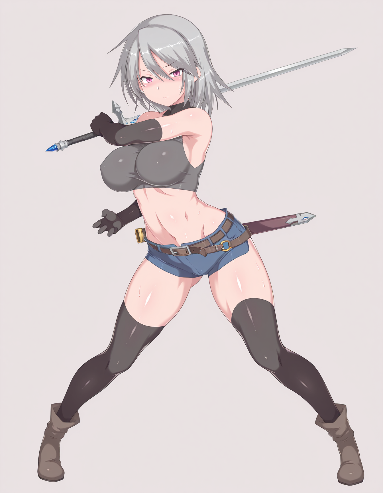 mai_smgrace,short_hair,grey_hair,pink_eyes,large_breasts,sleeveless_turtleneck,midriff,grey_coat,short_sleeves,fur_trim,belt,short_shorts,black_elbow_gloves,single_bare_arm,black_thighhighs,black_boots