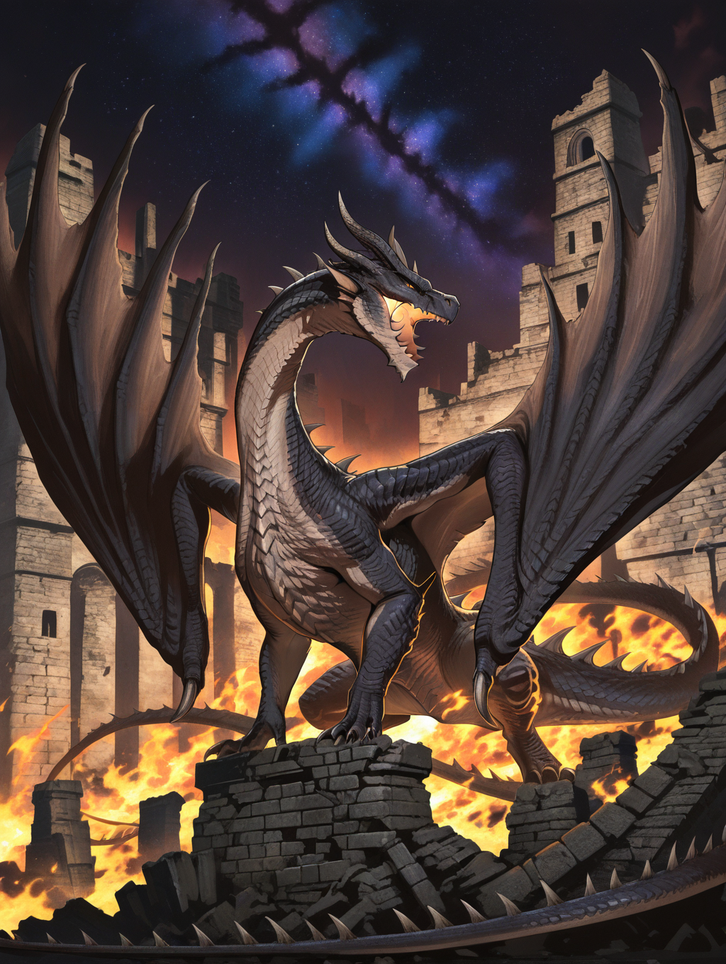 タグ(モンスター):1other、ファタリス、人間なし、黒いウロコ、開いた口、爪、巨大、黒いドラゴン、青い炎、鋭い歯、広げた翼、動物の焦点