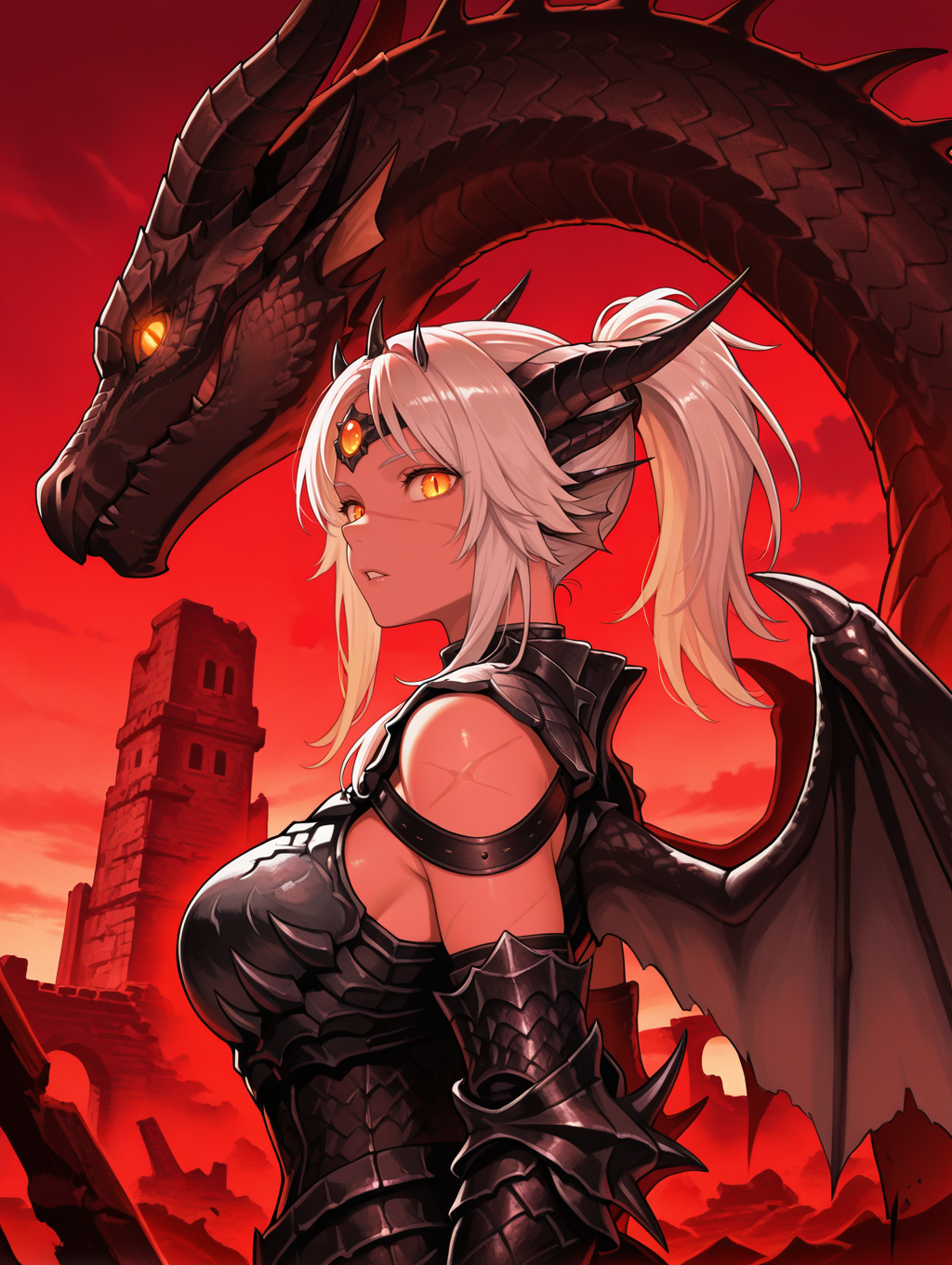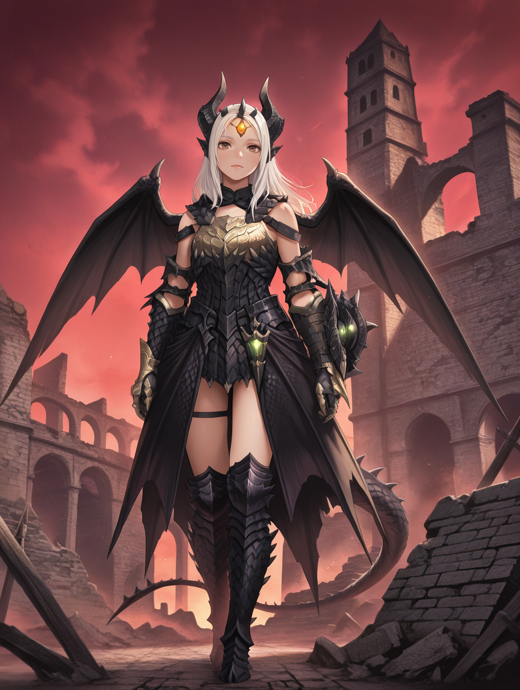 タグ(衣装):黒い角の頭飾り、額の宝石、頭部のヒレ、黒い腕バンド、黒い装甲手袋、胸板、黒い装甲ドレス、提灯、太ももバンド、黒い装甲ブーツ、黒いミニ翼、ドラゴンの尾、