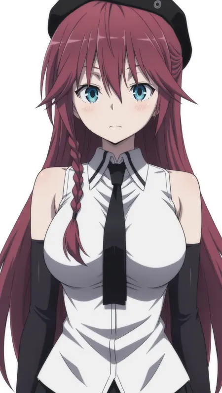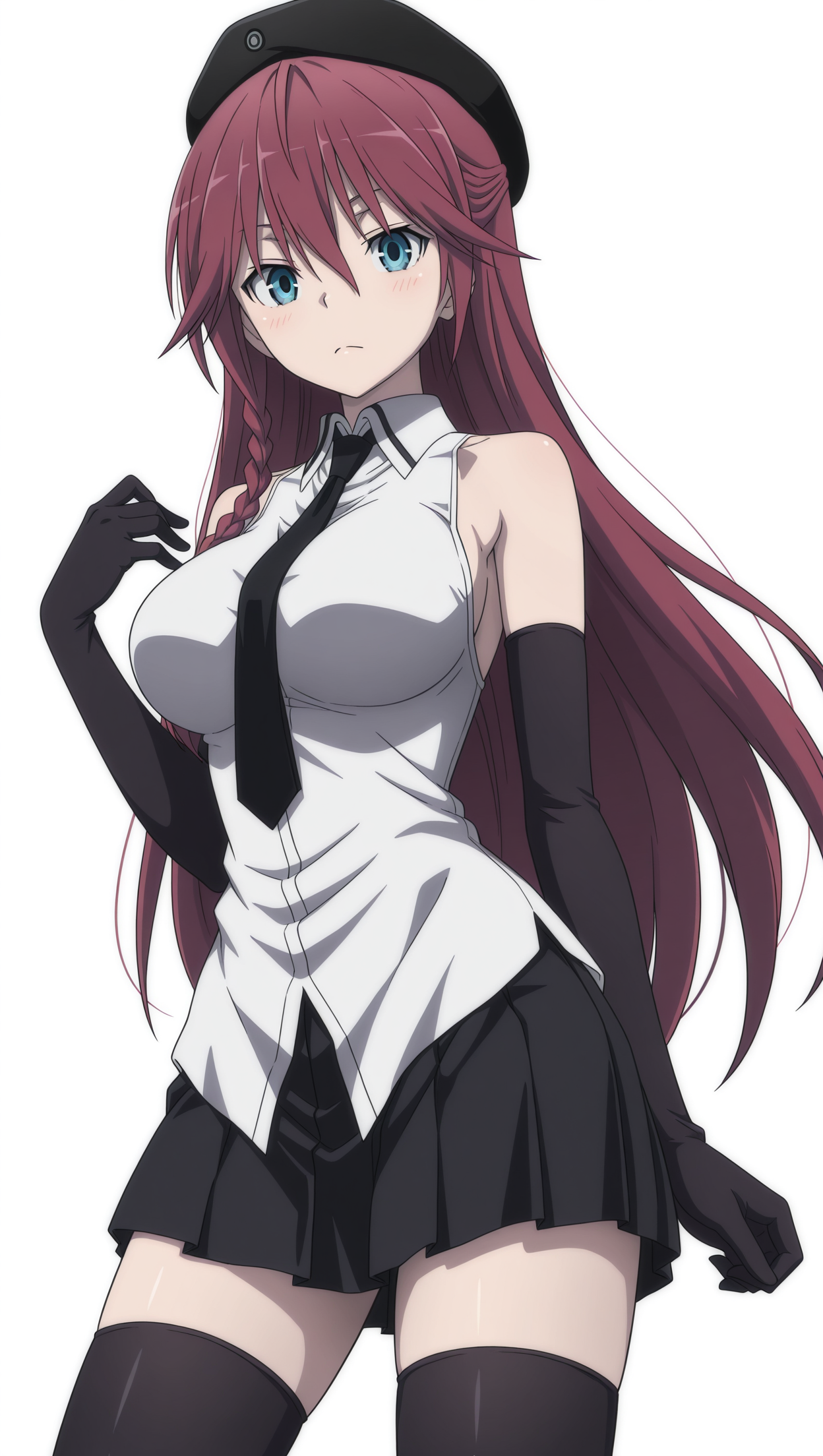 anime coloring, masterpiece, best quality, amazing quality, 4s4m1l1l1th, 1girl, long hair, braided sidelock, red hair, blue eyes, large breasts, beret, black beret, shirt, white shirt, collared shirt, sleeveless, necktie, black necktie, elbow gloves, black gloves, skirt, black skirt, pleated skirt, thighhighs, black thighhighs, solo, pose, standing, looking at viewer, white background, simple background