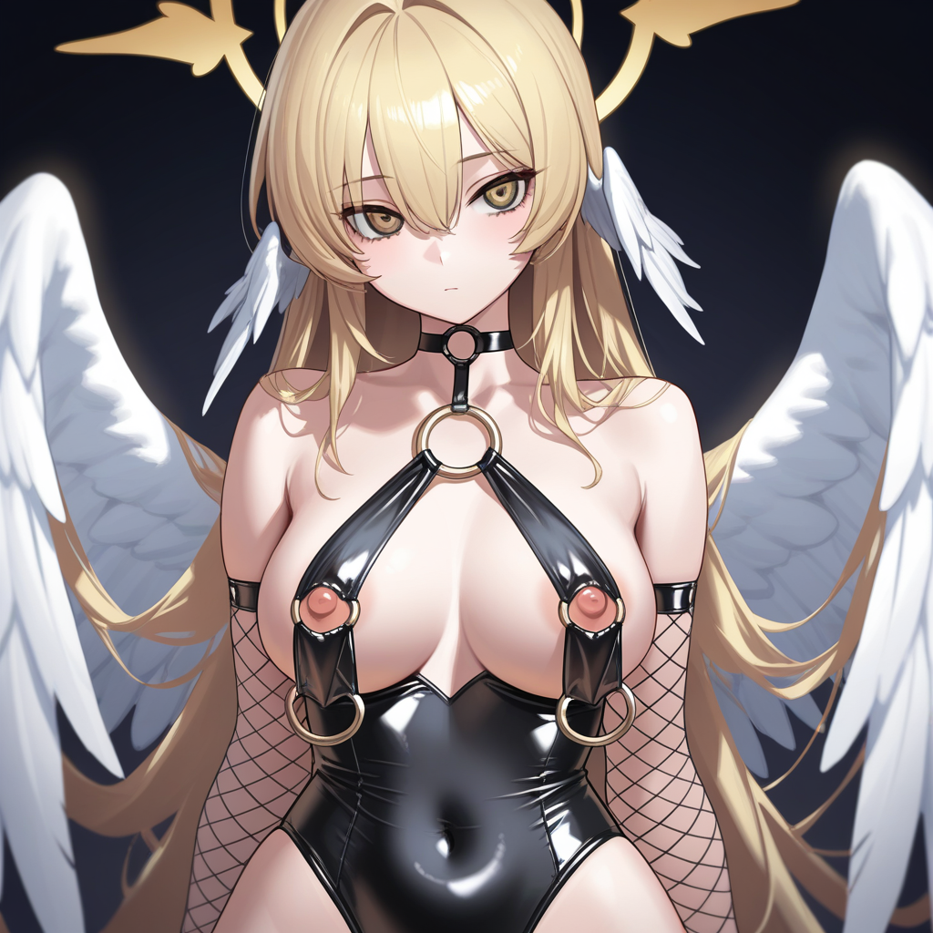トリガー語: 1girl, black leotard, black one-piece swimsuit, o-ring breast curtains, nipleless clothes, nipple cutout, o-ring choker, covered navel, detached sleeves, fishnet gloves
