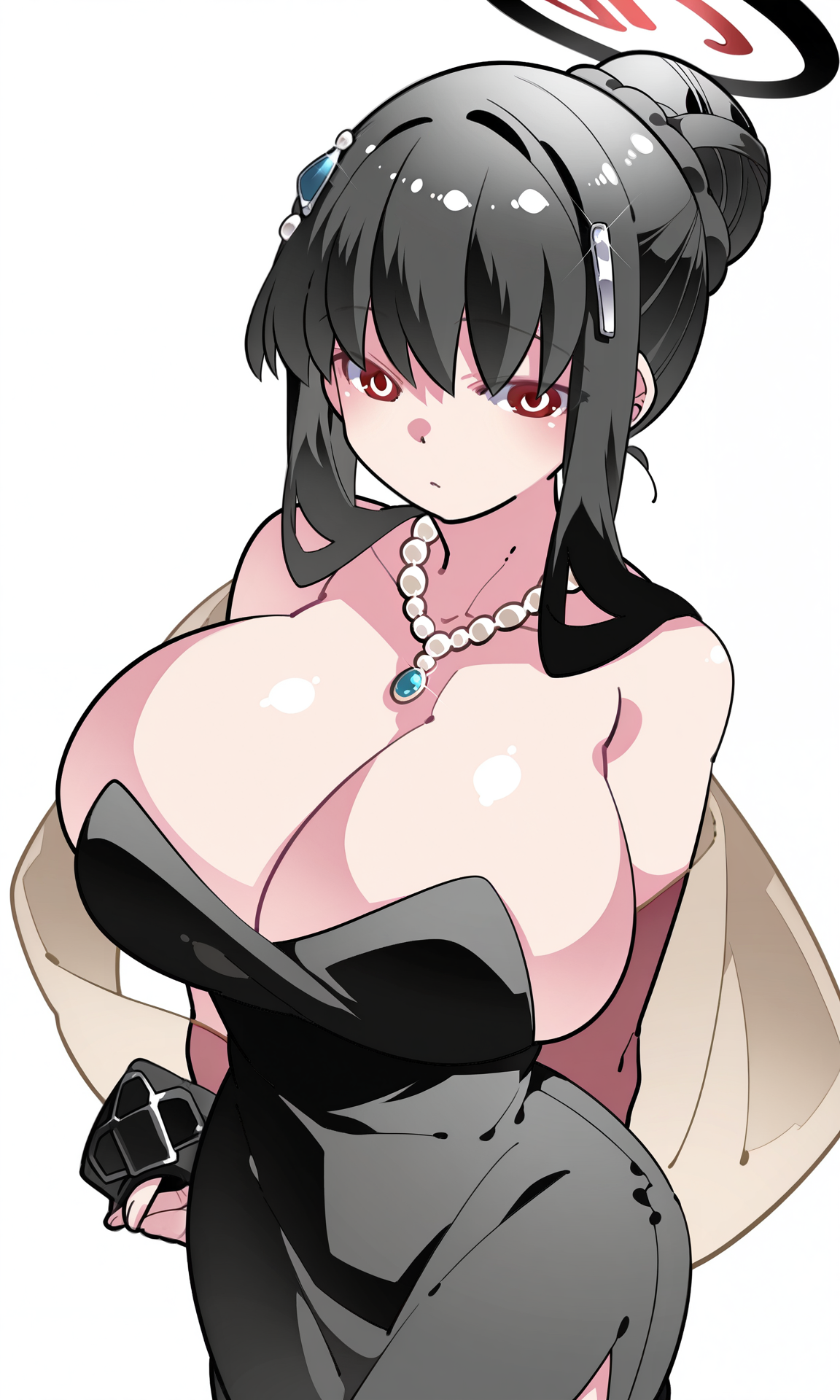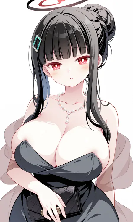 목걸이, 진주 목걸이, 드레스, (검은 드레스), 등이 드러난 드레스, 스트랩 없음, 스트랩 없는 드레스, 긴 드레스, 어깨 노출, 가슴 노출, 허리 오목, 스카프, 투명 스카프,