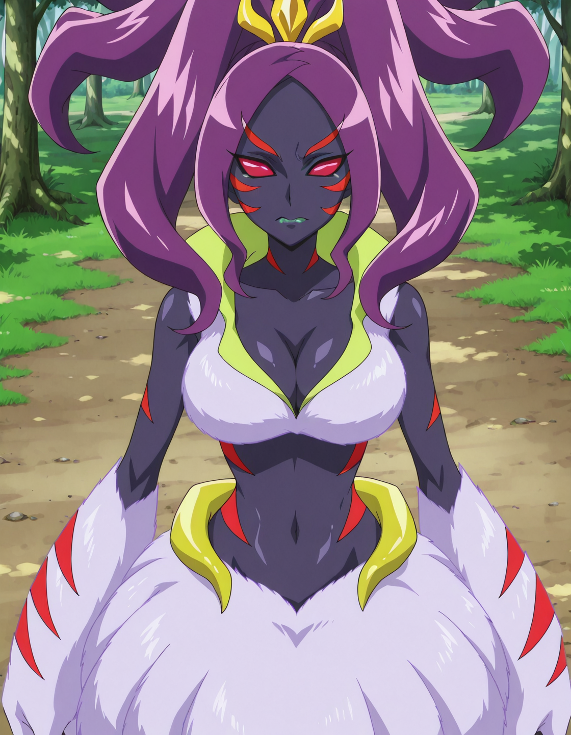 애니메이션 스크린캡, 솔로, 1소녀, sparda, 배꼽, 몬스터 걸, 동공 없음, lora:sparda_IL:0.8 고해상도, 놀라운 품질, 최고 품질, 매우 미학적, 걸작, absurdres,