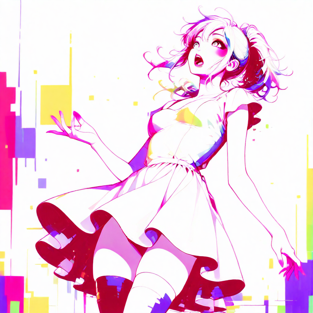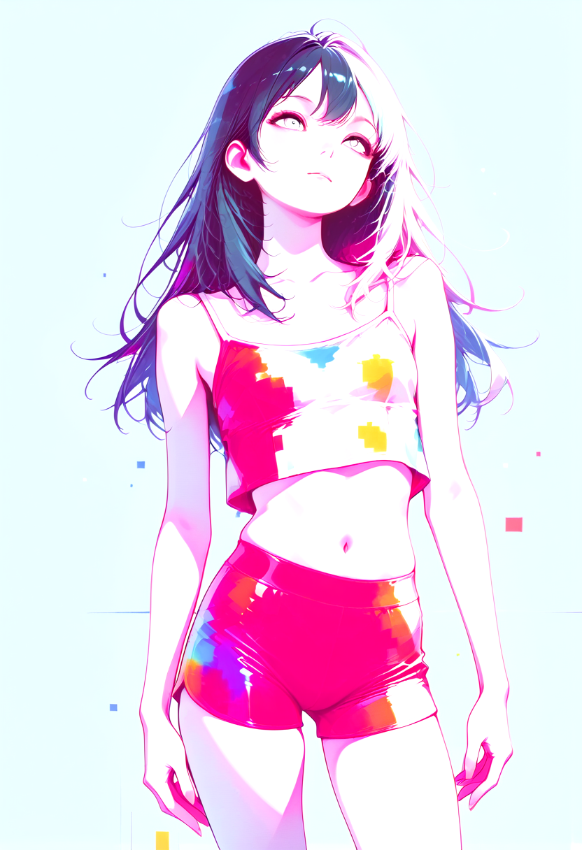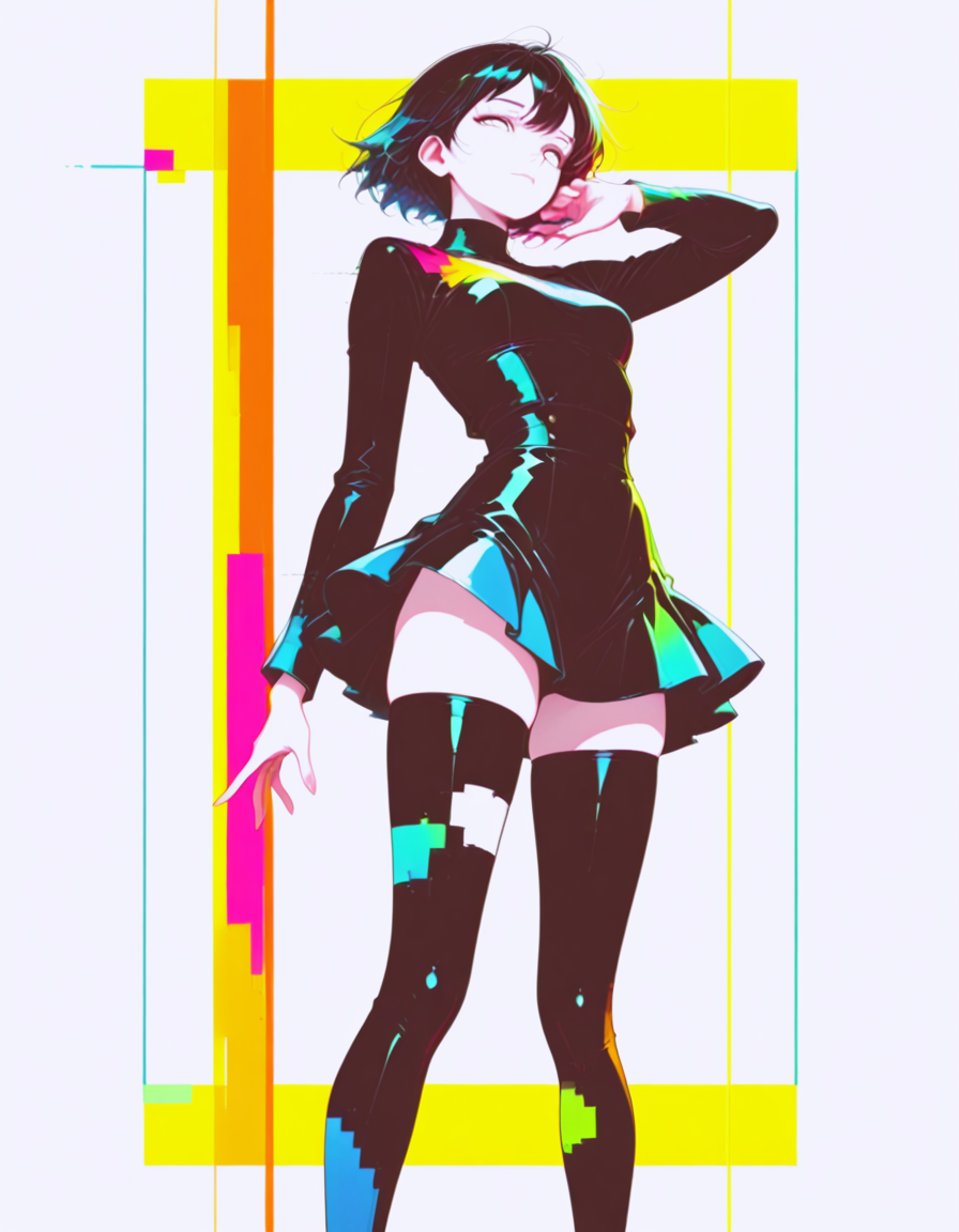 사이버펑크 글리치 미학을 결합한 대담한 네온 애니메이션 스타일, 고대비 조명, 채도 높은 팔레트, 그래픽 색상 블로킹, 디지털 왜곡 효과 및 미니멀리즘 추상 배경.