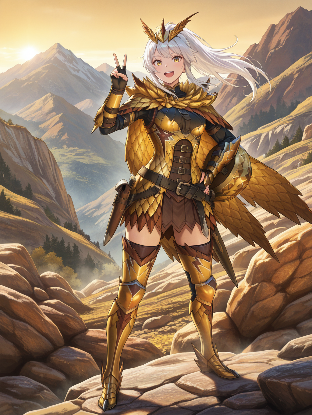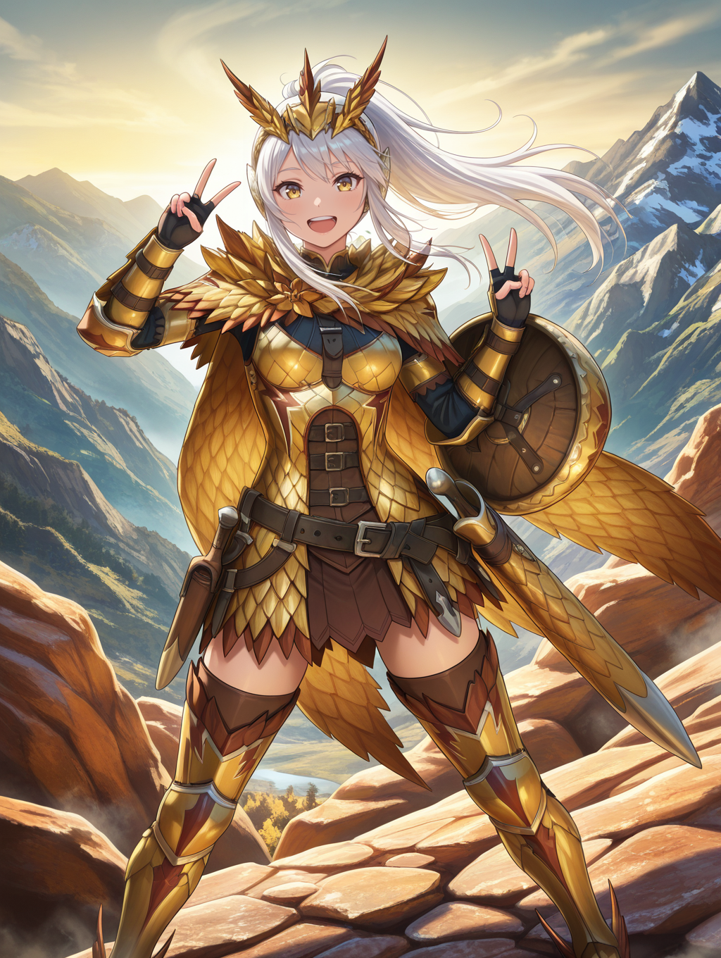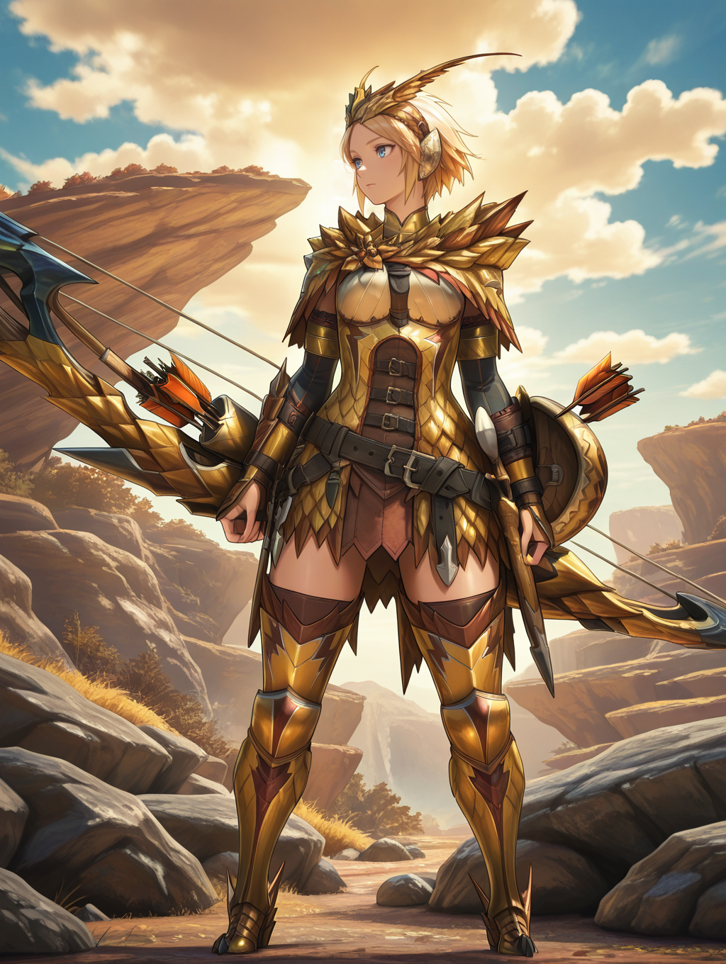 タグ(衣装1):セレギオスアーマー、ゴールドスケールアーマー、フェザーヘッドドレス、スケールケープ、肩甲板、胸甲、アーマードレス、アーマードグローブ、シールド、複数のベルト、収納済み、茶色のタイツ、アーマードブーツ