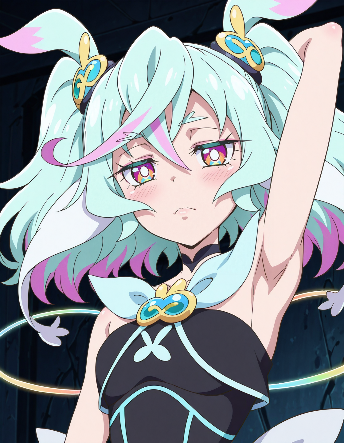 애니메이션 스크린캡, 싱글, 1소녀, 블랙수프림 복장, curesupreme, 파란 리본넥타이, 밝은 눈동자, lora:curesupreme_IL:0.8