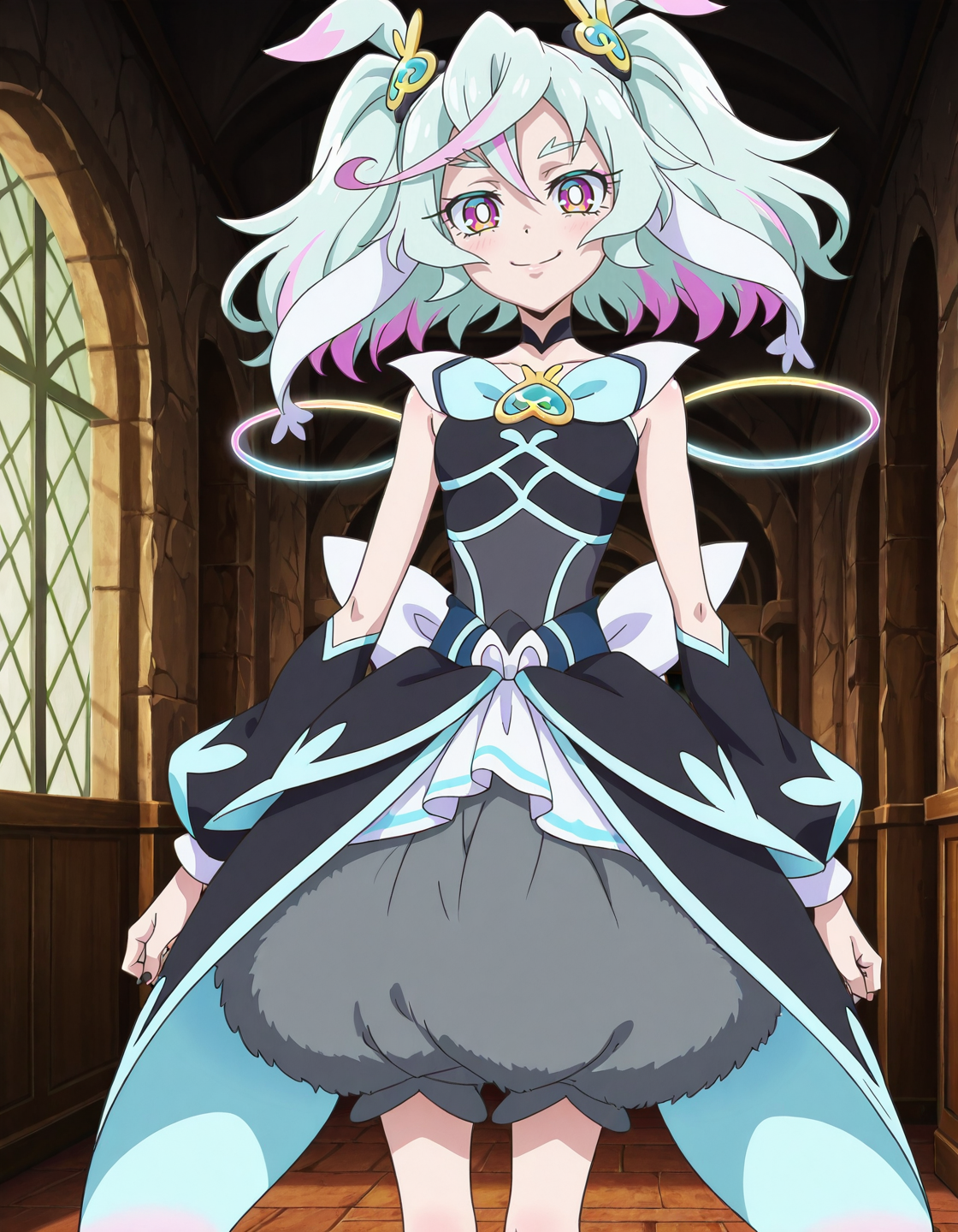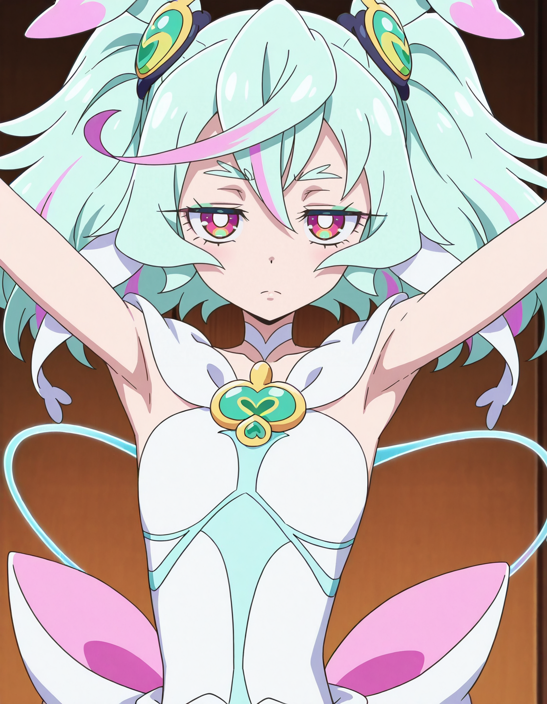 애니메이션 스크린캡, 싱글, 1소녀, 화이트수프림 복장, curesupreme, 밝은 눈동자 lora:curesupreme_IL:0.8