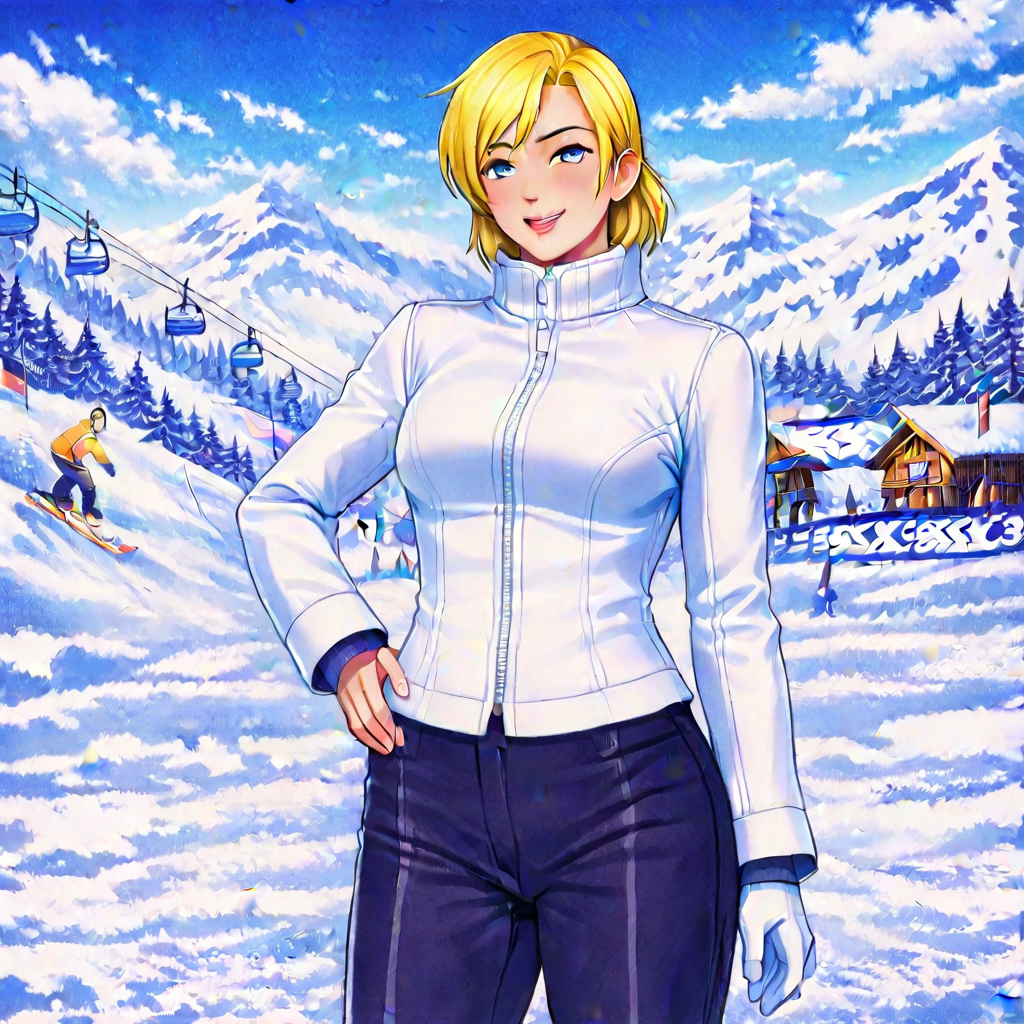 | トレーニングワード | adult woman in her 30s, blonde short hair, blue eyes, confident expression, white fitted zip-up jacket, cropped winter jacket, black snow pants, athletic build,コピーしました! ski resort background, snowy mountains, ski lift, winter daylightコピーしました! |