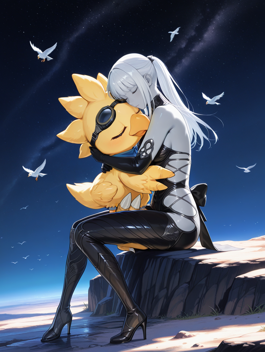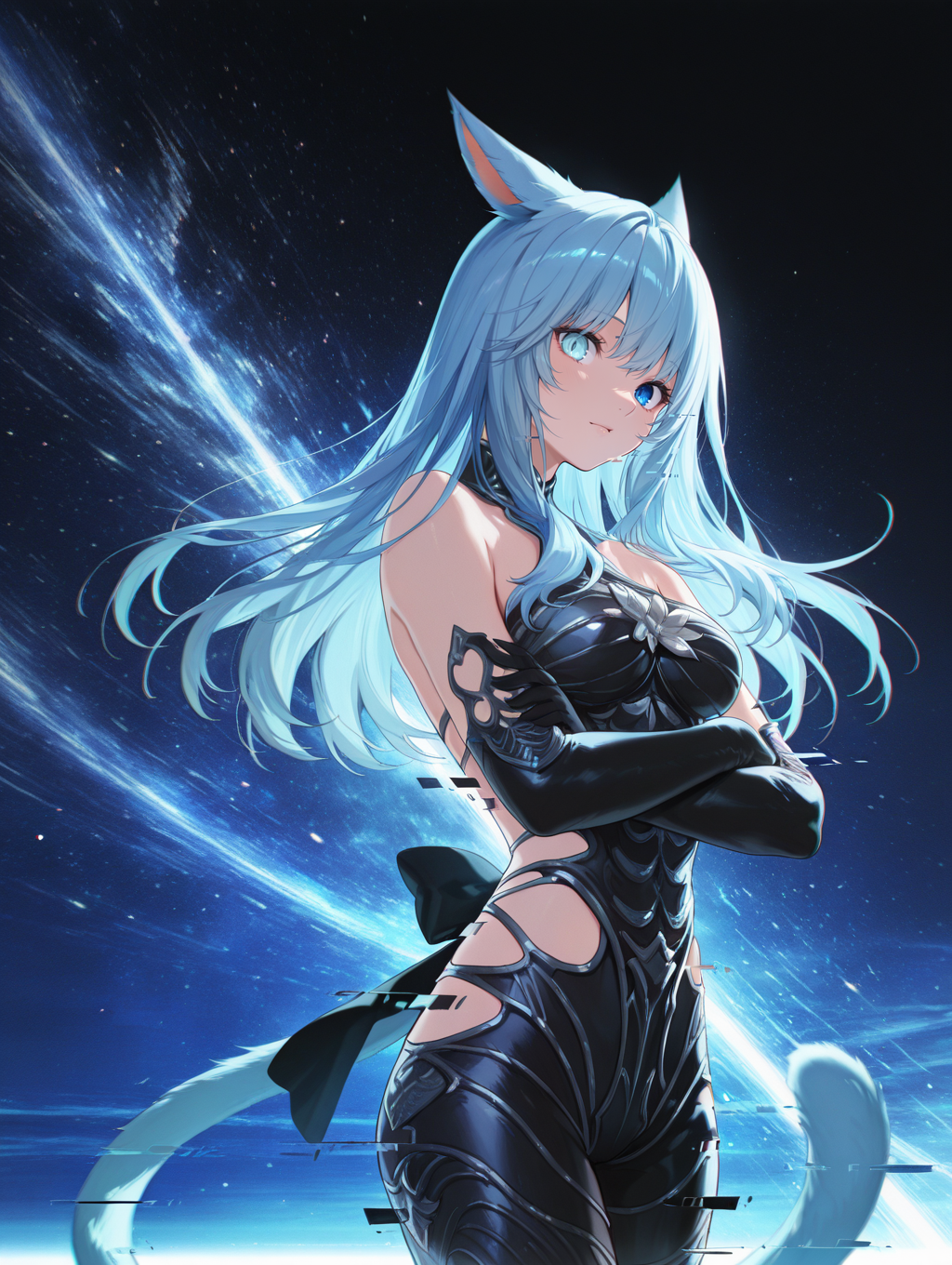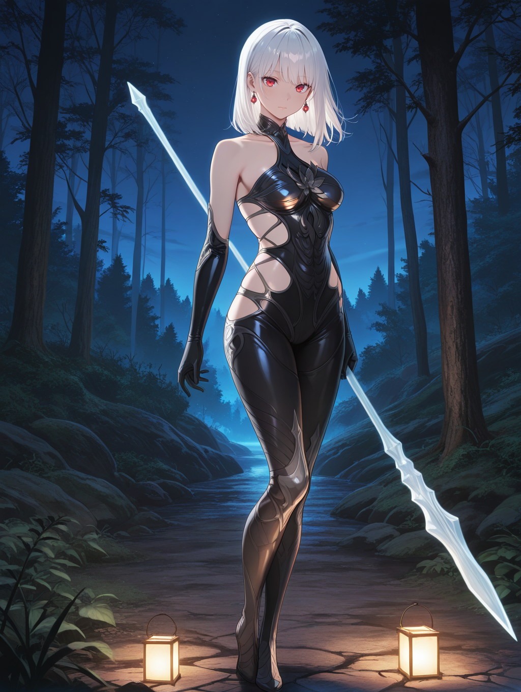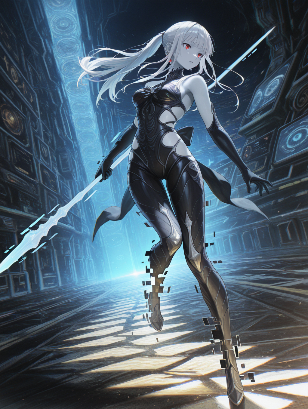 タグ(衣装):オメガアーマー、イヤリング、黒い背中が露出したボディスーツ、黒い肘手袋、黒い太ももブーツ