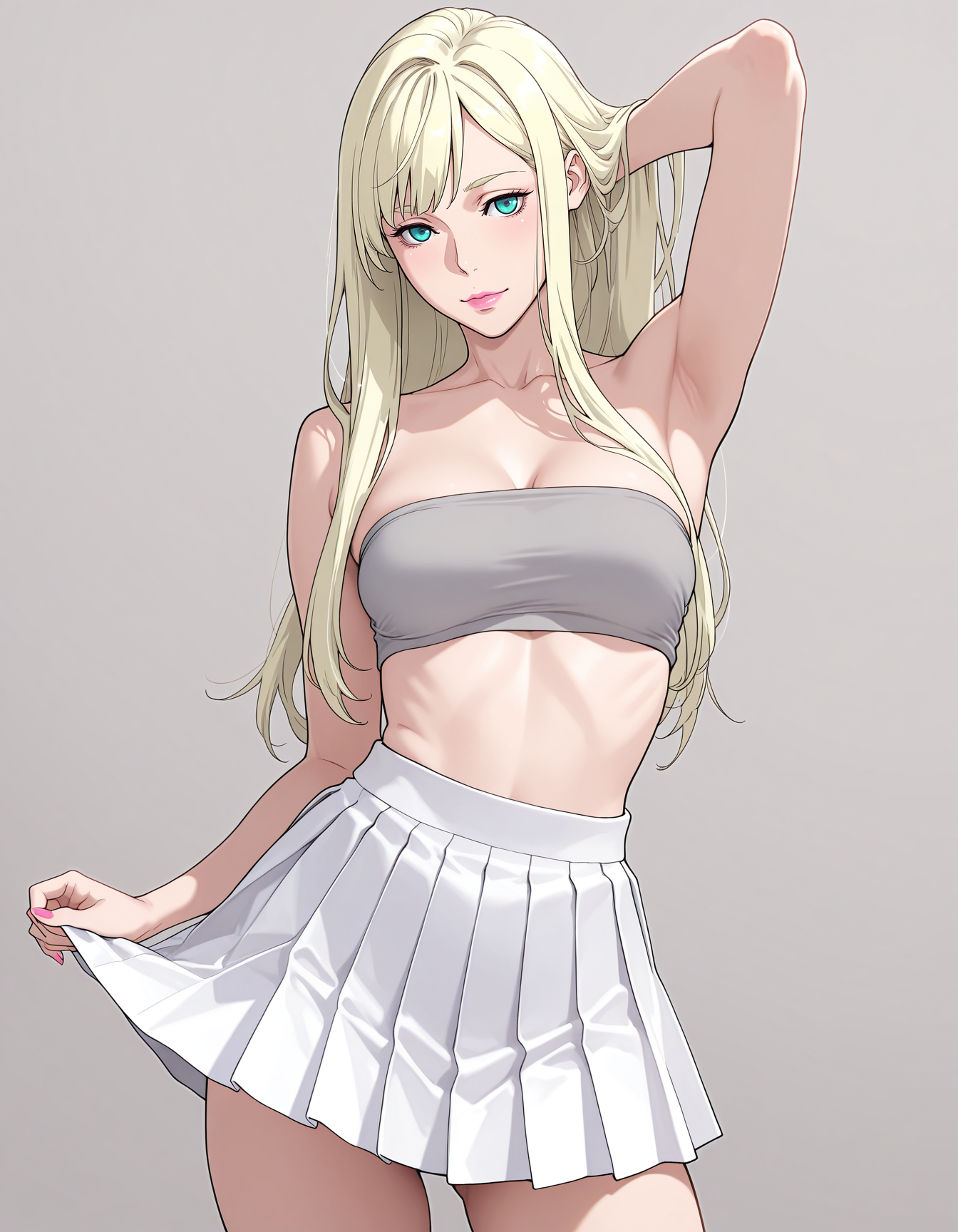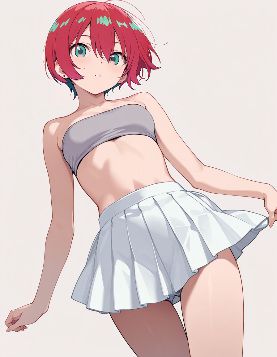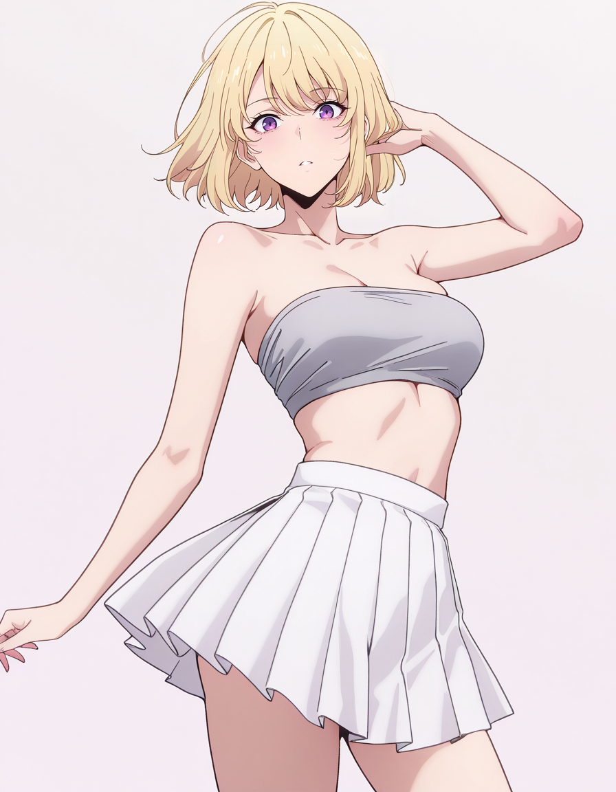mai_grey_tube_top,pleated_skirt,white_skirt