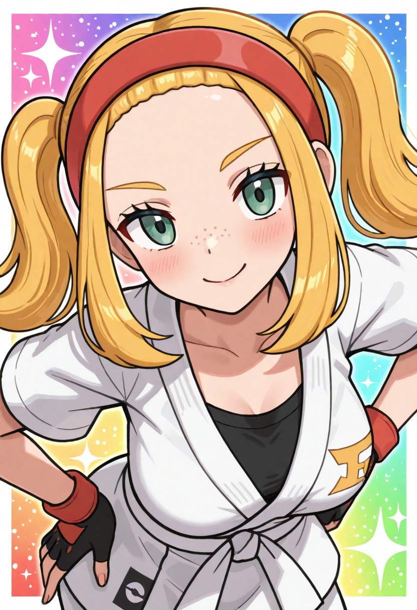 | 학습된 단어 | zajosee, josee \(pokemon\), green eyes, blonde hair, twintails, sidelocks, forehead, freckles, red hairband, aged up복사됨! fingerless gloves, two-tone gloves, black gloves, red gloves, black shirt, white dougi, white jacket, short sleeves, martial arts belt, white belt, white pants, black socks, two-tone shoes, black footwear, red footwear복사됨! |