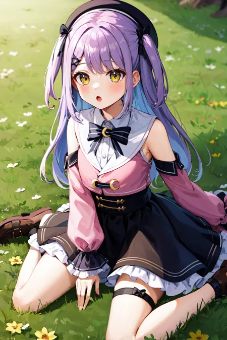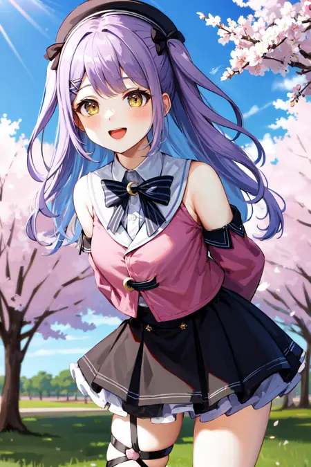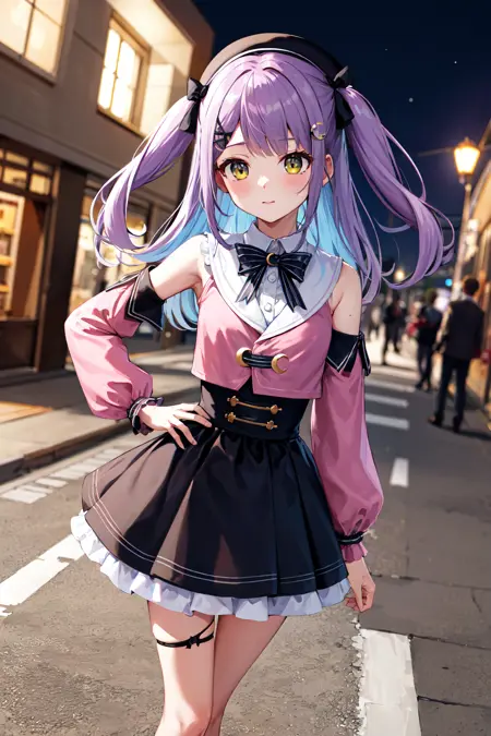 衣装2aaruna、長い髪、両サイドアップ、髪のリボン、ベレー帽、黒い頭部装飾、黒いボウタイ、三日月、肩の切り替え、ピンクのシャツ、取り外し可能な袖、長袖、黒いスカート、フリル付きスカート、片方の太ももハイ