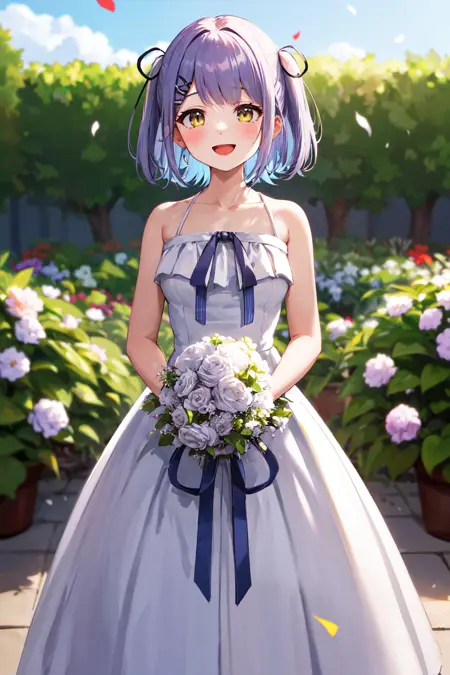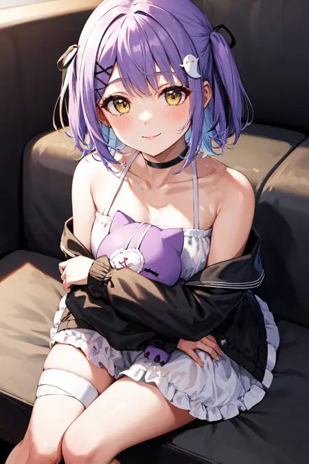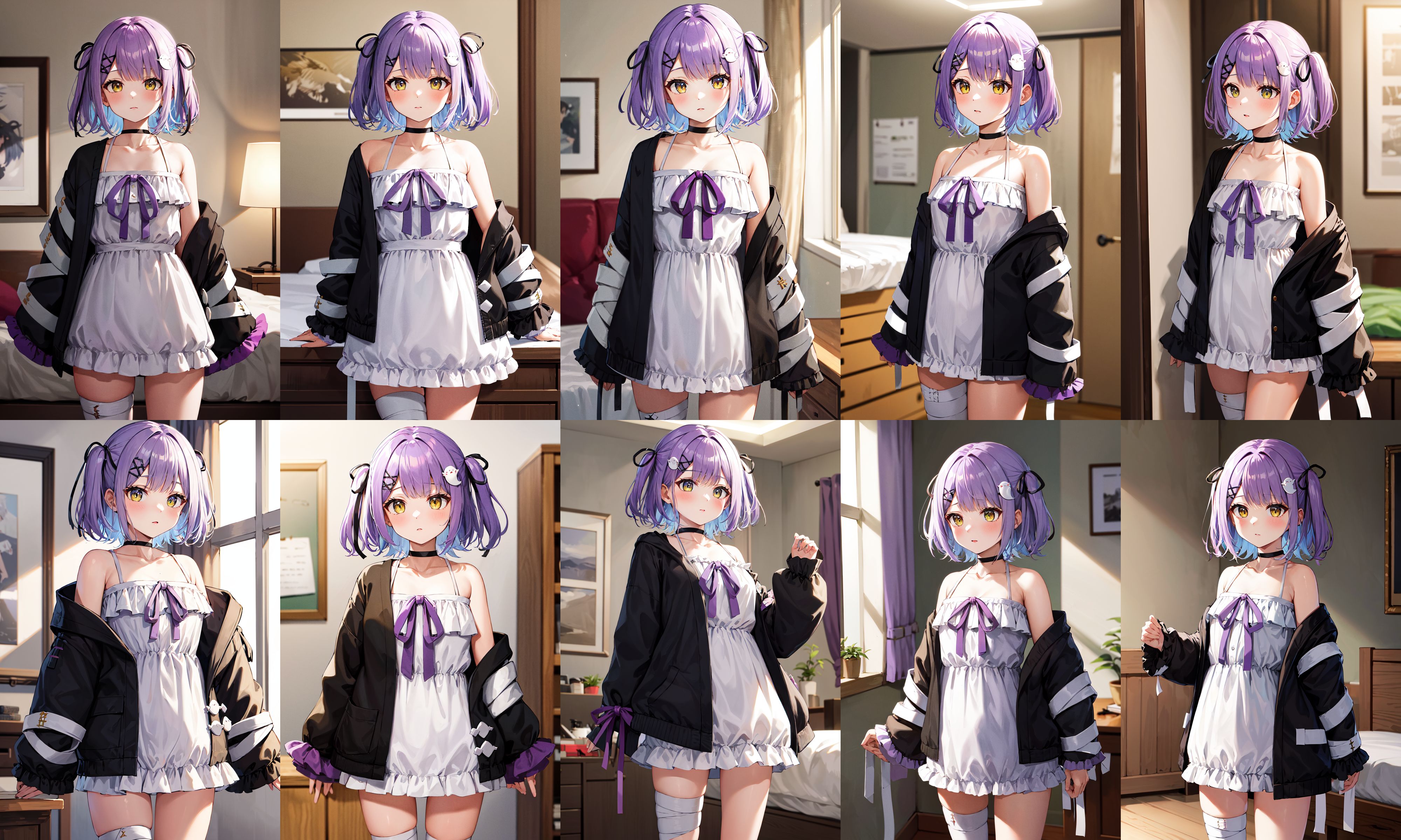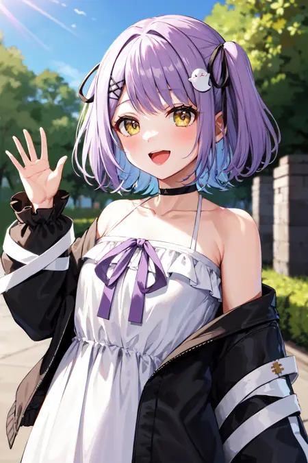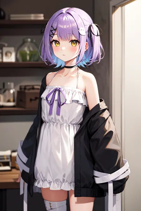 衣装1aaruna、短い髪、両サイドアップ、黒いリボン、髪飾り、ヘアクリップ、黒いチョーカー、鎖骨、肩出し、フリル、白いドレス、紫のリボン、オフショルダー、黒いジャケット、開いたジャケット、長袖、指より長い袖、包帯