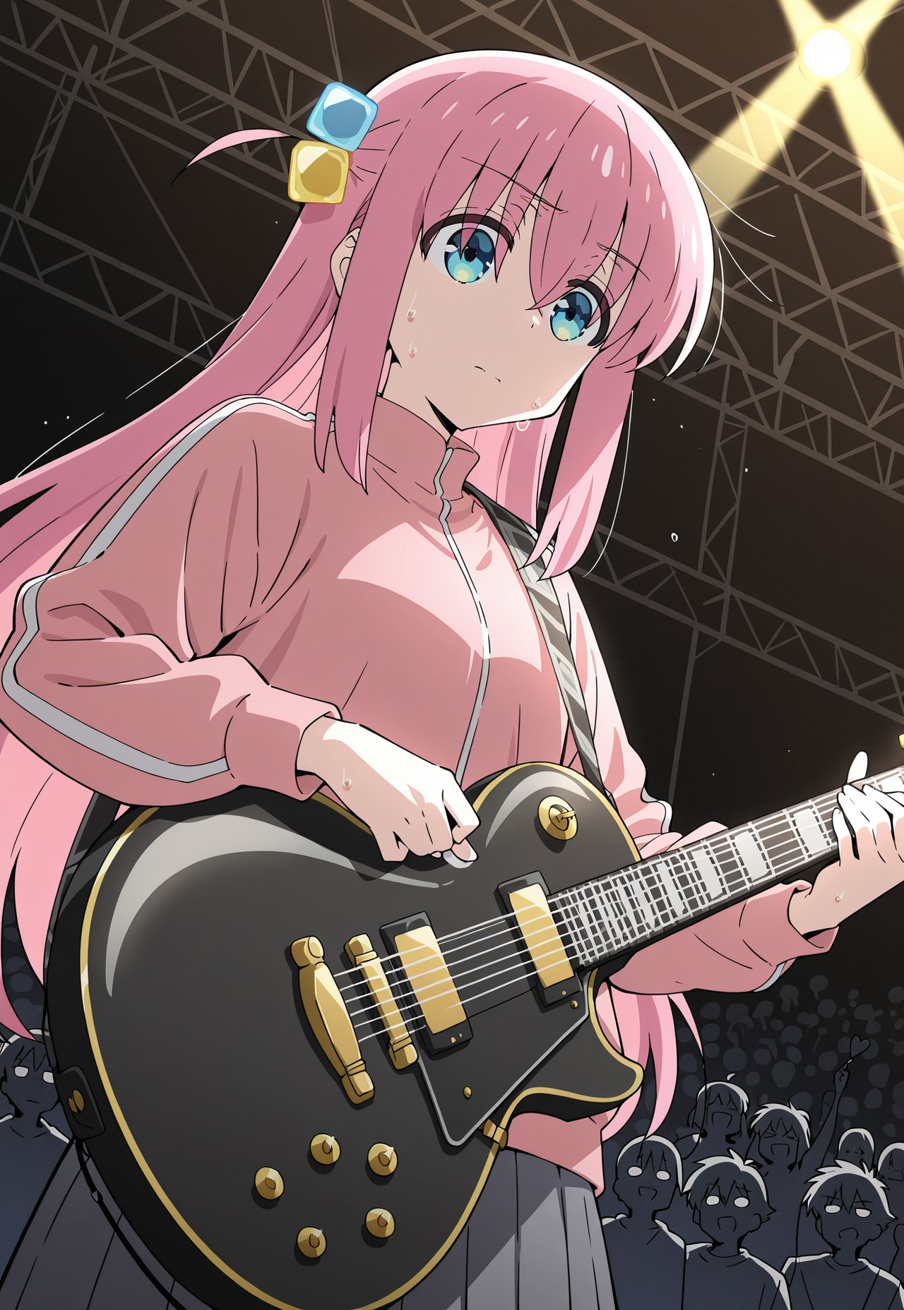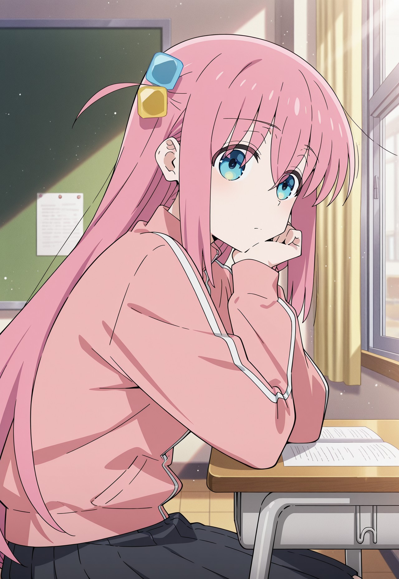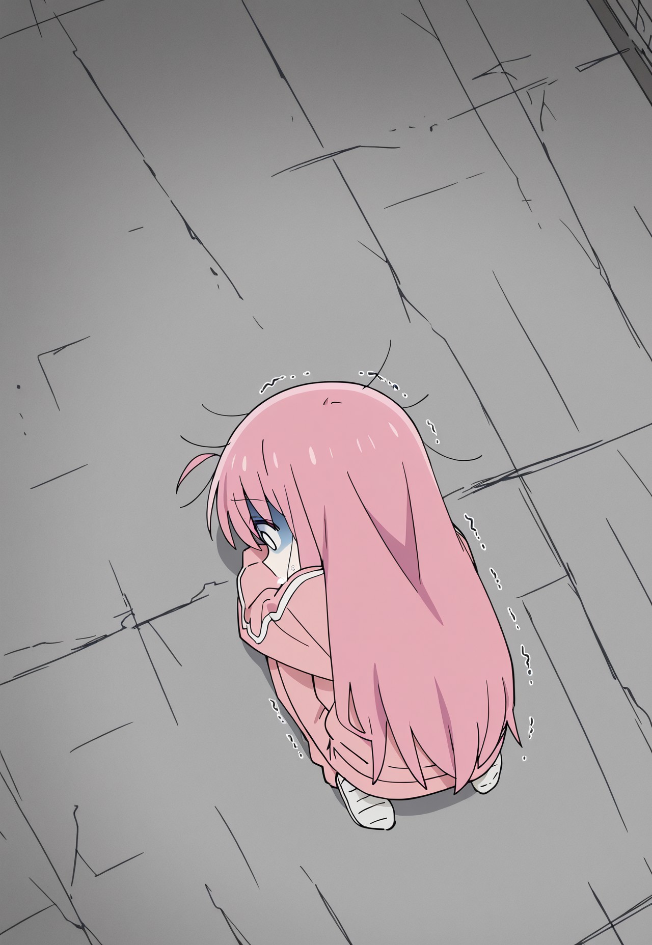 (masterpiece, best quality), anime screencap, lora:hitori-gotoh:0.9, gotoh hitori, 1girl, ピンクの髪, ヘアキューブ, 青い目