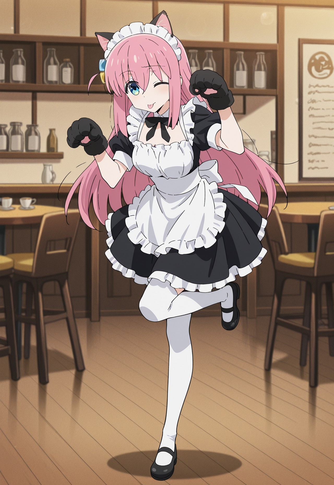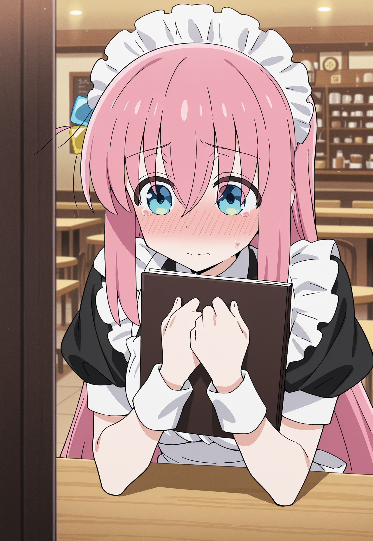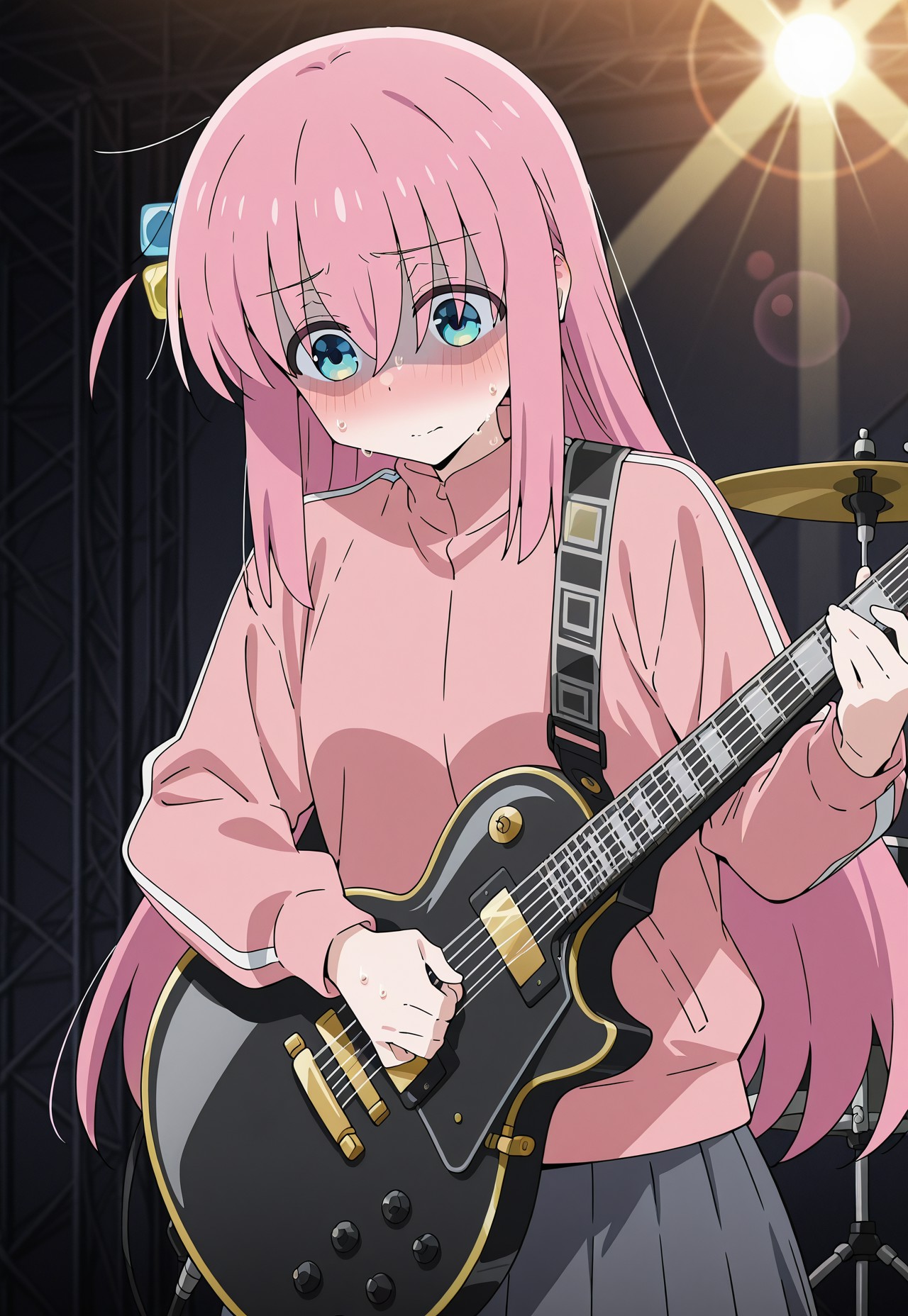 (masterpiece, best quality), anime screencap, lora:hitori-gotoh:0.9, gotoh hitori, 1girl, ピンクの髪, ヘアキューブ, 青い目