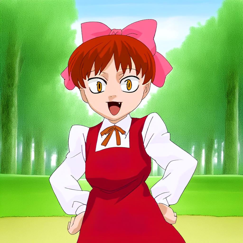 ベース衣装:nekomsm2007、栗色の短髪、ピンクのヘアリボン、牙、黄色い目、ツリメ、濃赤色のエプロンドレス、白い長袖シャツ、茶色のネックリボン