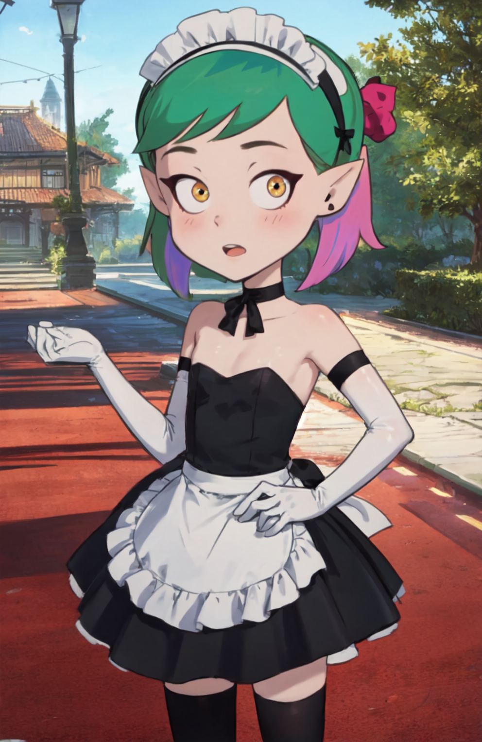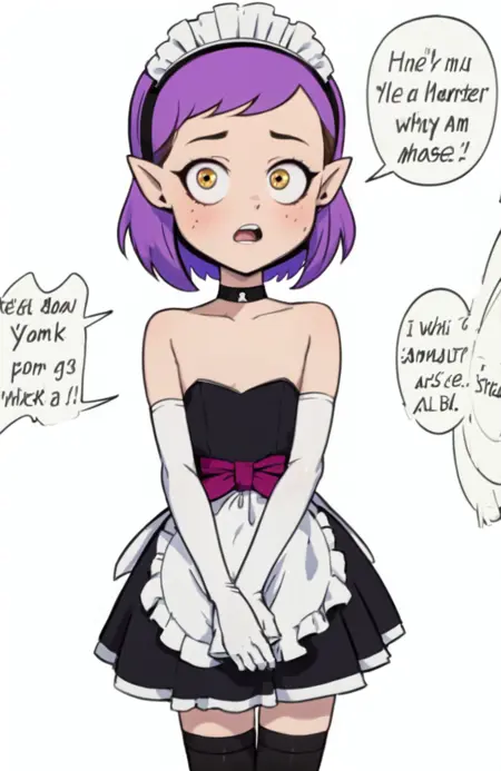 추가 의상 4: thighhighs, gloves, dress, bare shoulders, flat chest, alternate costume, choker, pointy ears, elbow gloves, black thighhighs, white gloves, apron, black dress, speech bubble, english text, maid, maid headdress, strapless, black choker, short dress, waist apron, strapless dress, maid apron, wide-eyed, enmaided