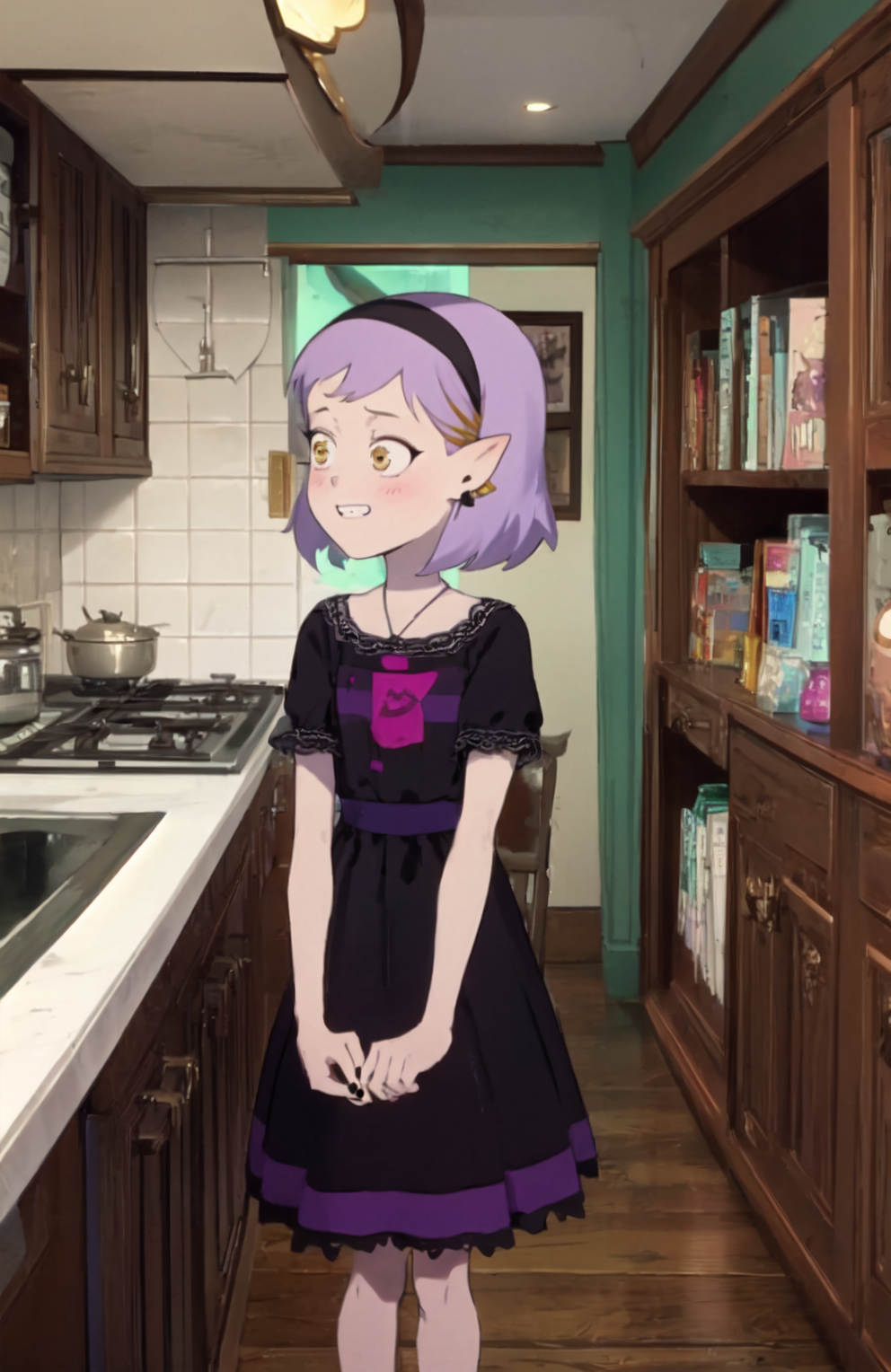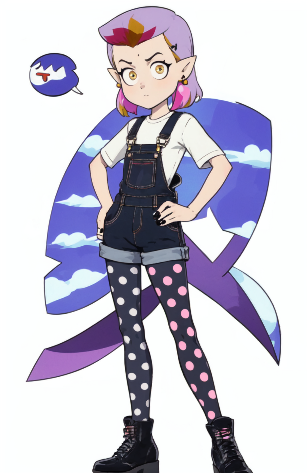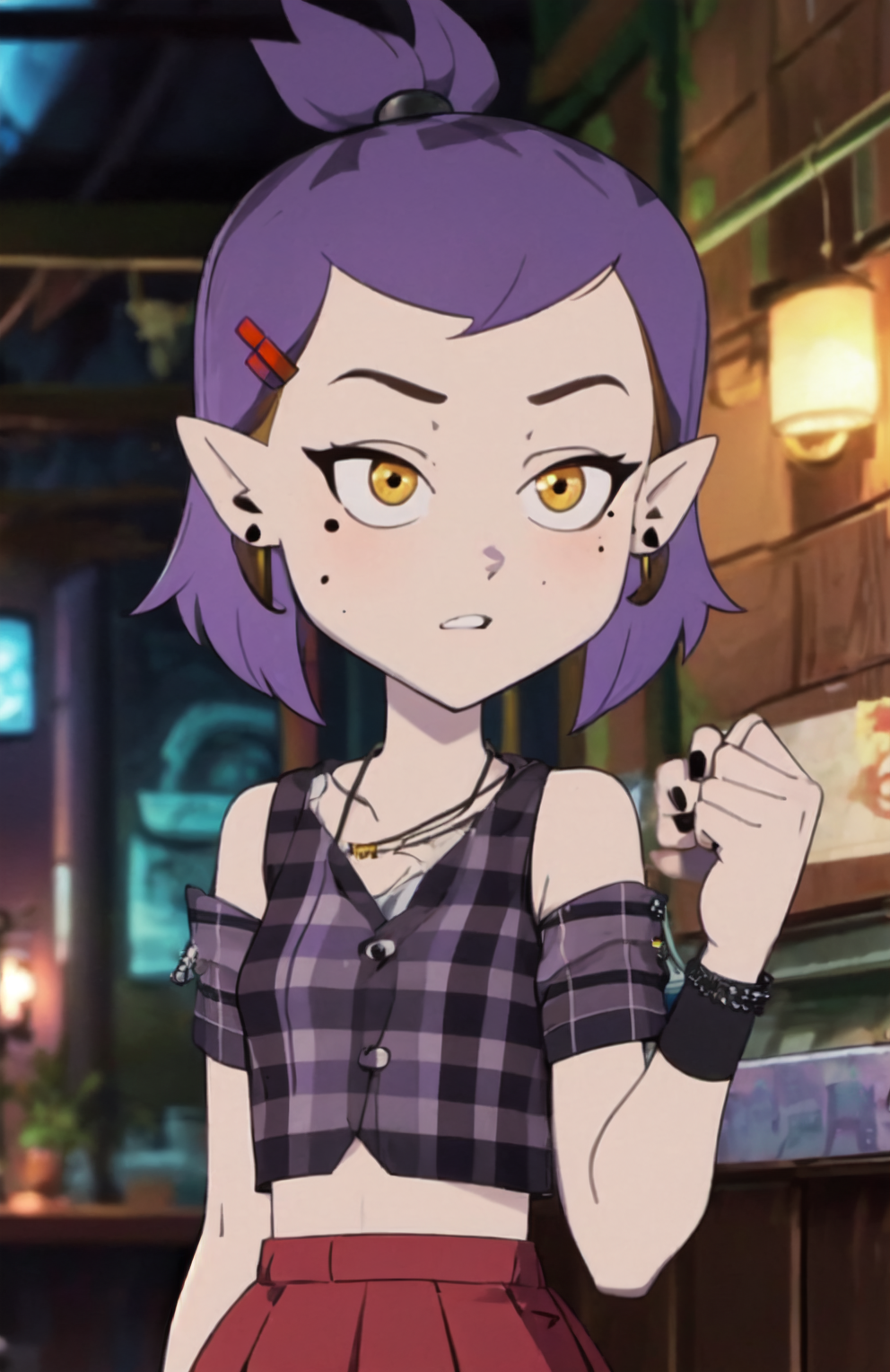 시즌 2: amity_blight, S2 hair, short hair, open mouth, bangs, skirt, shirt, long sleeves, flat chest, standing, yellow eyes, purple hair, pantyhose, teeth, pointy ears, black skirt, looking to the side, black shirt, red pantyhose
