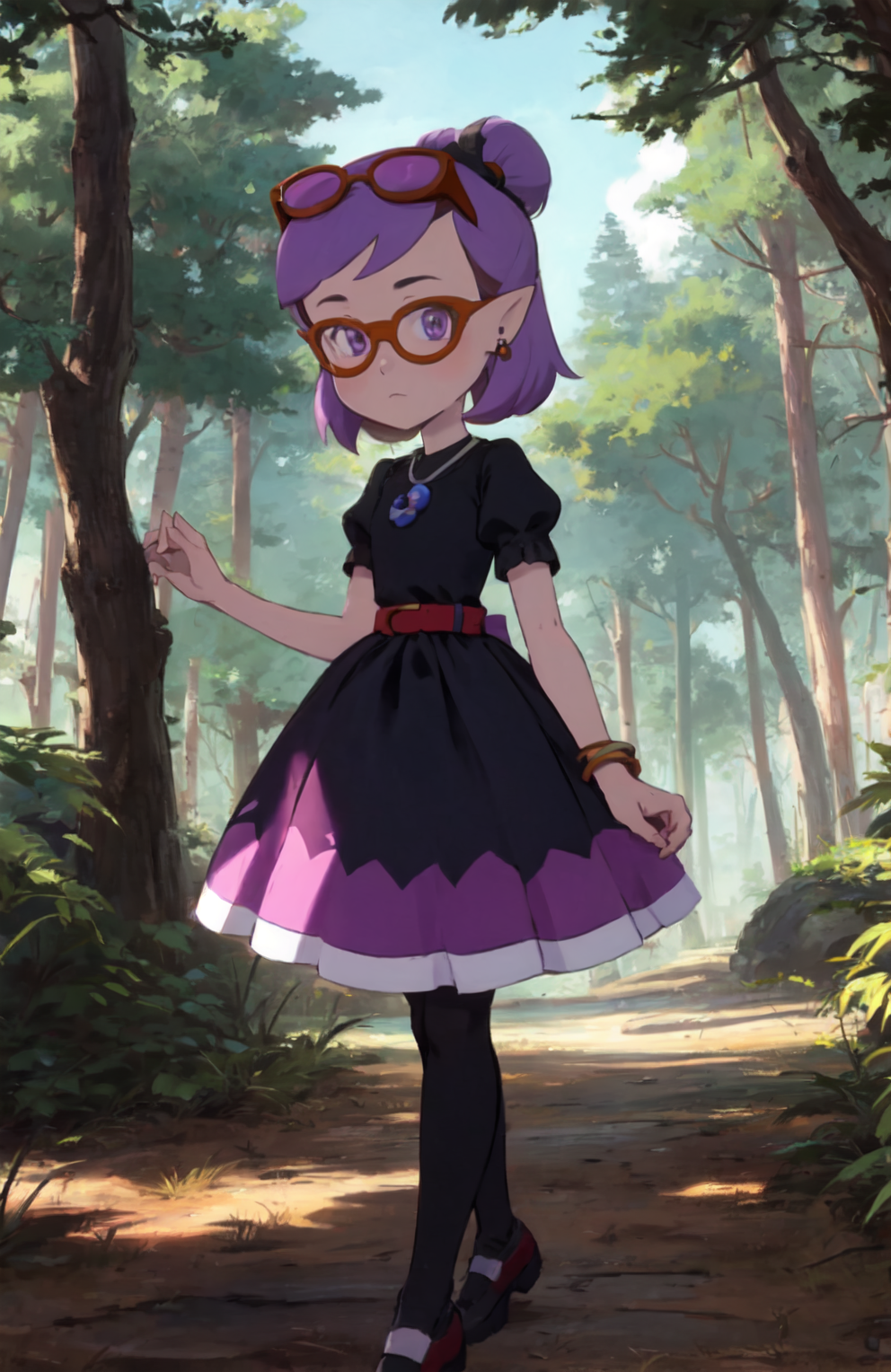 추가 의상 1: dress, jewelry, closed mouth, standing, purple hair, short sleeves, flat chest, pantyhose, earrings, puffy sleeves, belt, black dress, puffy short sleeves, mask, parody, sunglasses, purple dress, poke ball, style parody, tinted eyewear