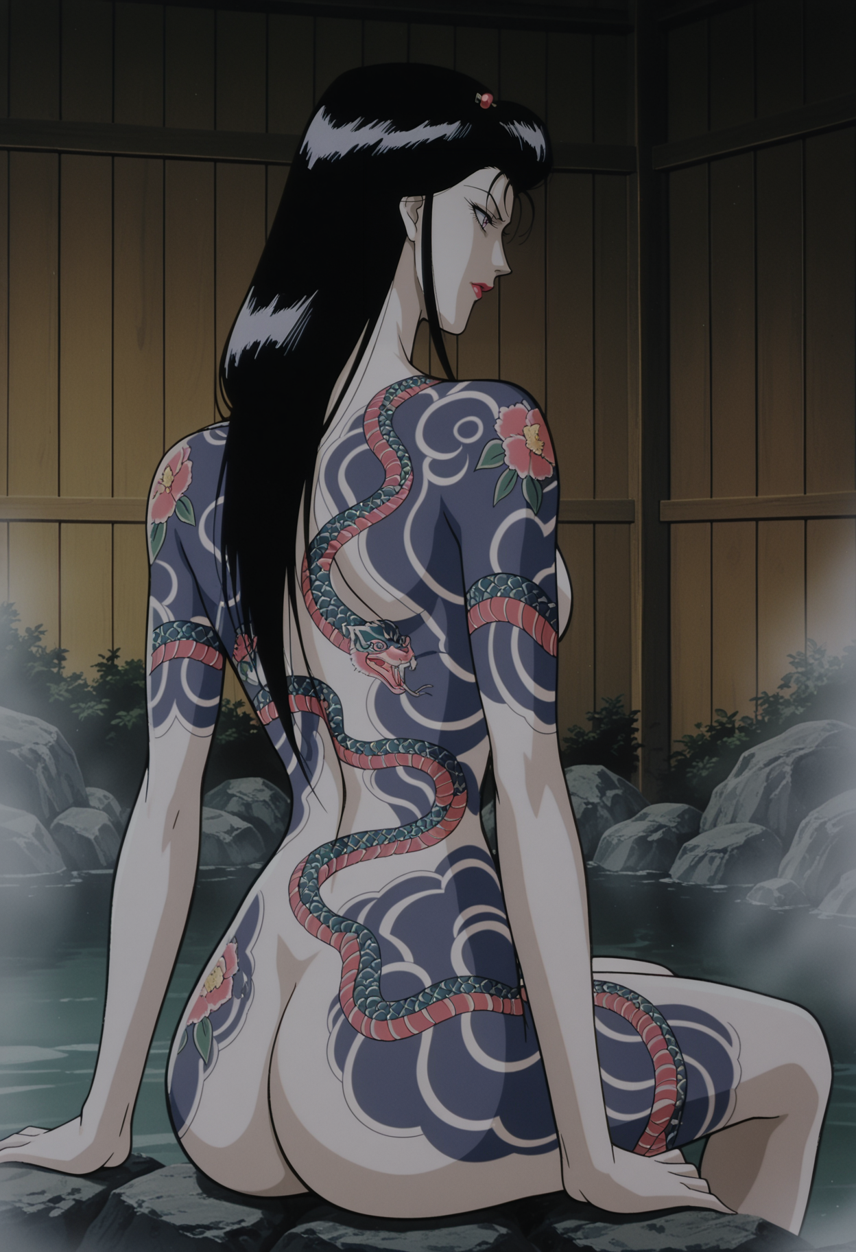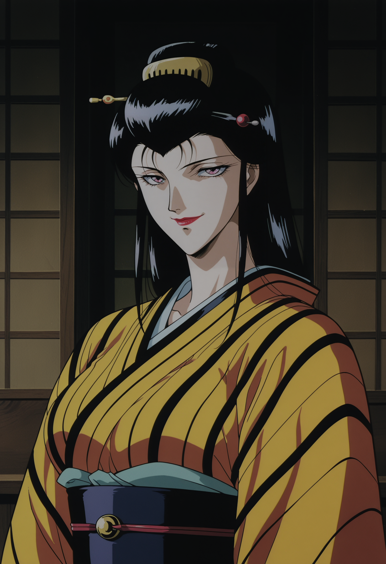 1girl,solo,mm,mature female,long hair,black hair,hair ornament,hair stick,lipstick,pink eyes,retro artstyle,anime coloring