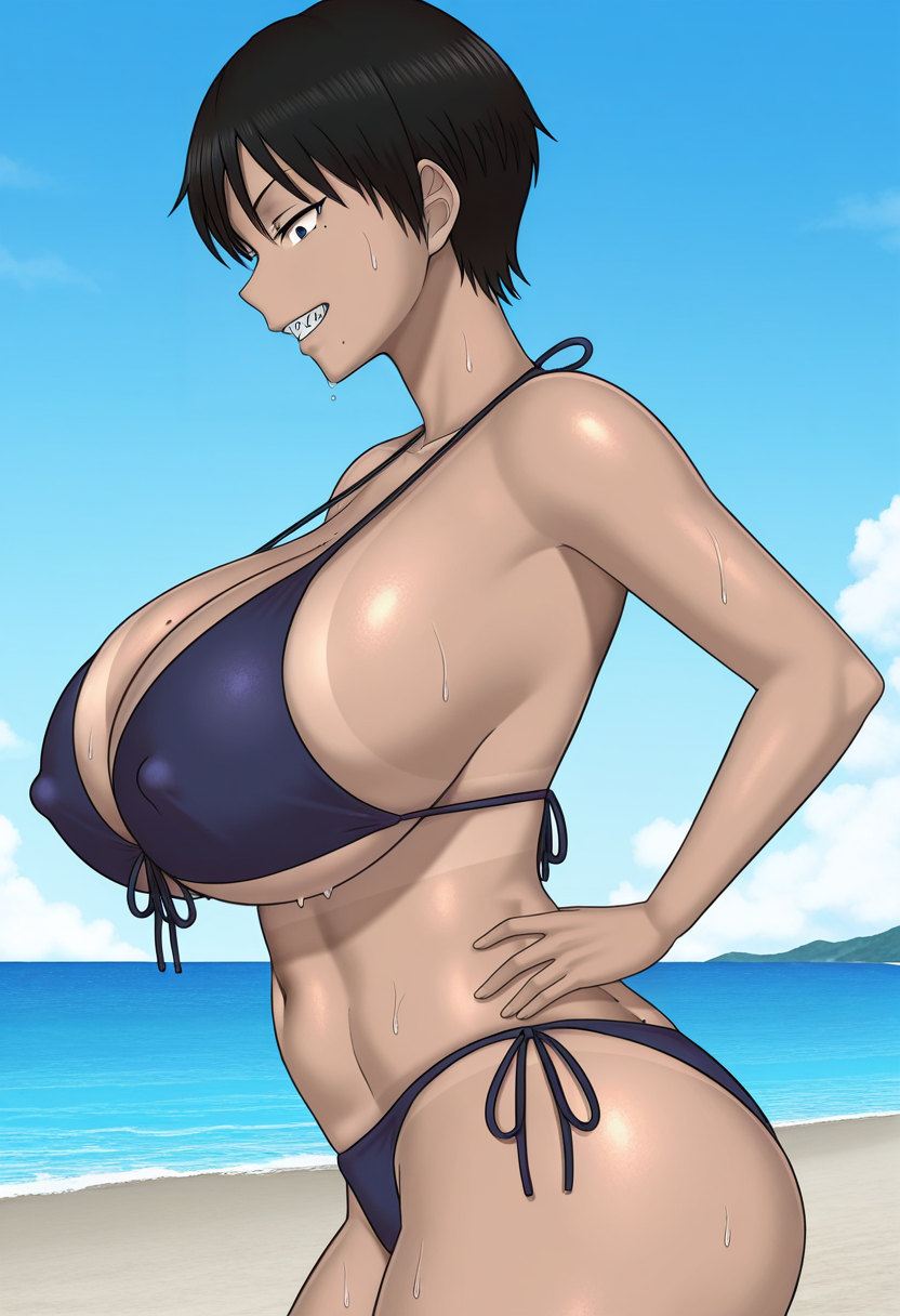 HaruTomboy, 1girl, solo, tomboy, short hair, black hair, black eyes, sharp teeth, huge breasts, curvy, wide hips, mole, dark-skinned female, tanlines, tan, mole under mouth, mole on breast, toned belly, toned body, curvy hips, white tank top, covered nipples, cleavage, bare shoulders, navel, white tank top, black shorts, short shorts, barefoot,
