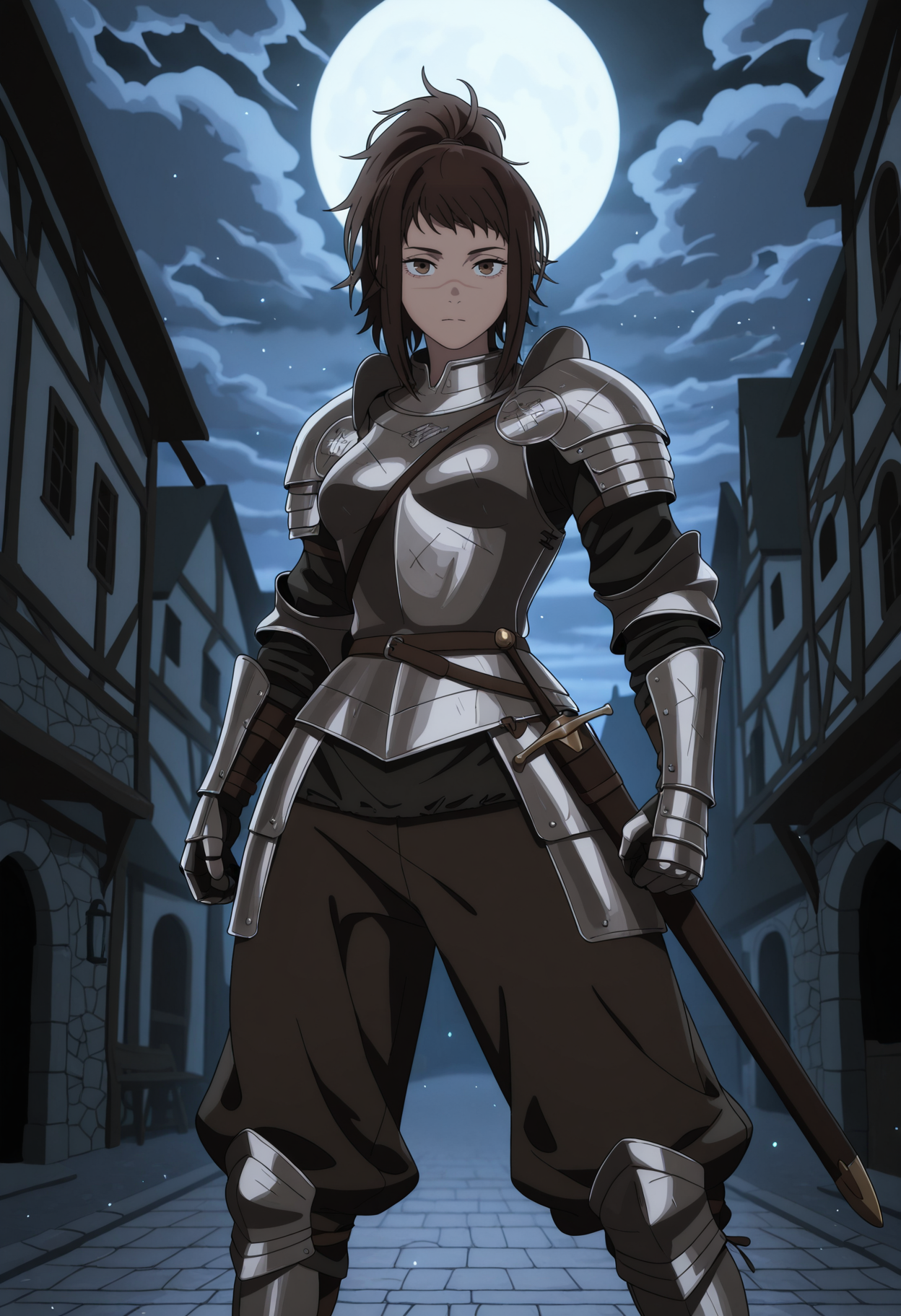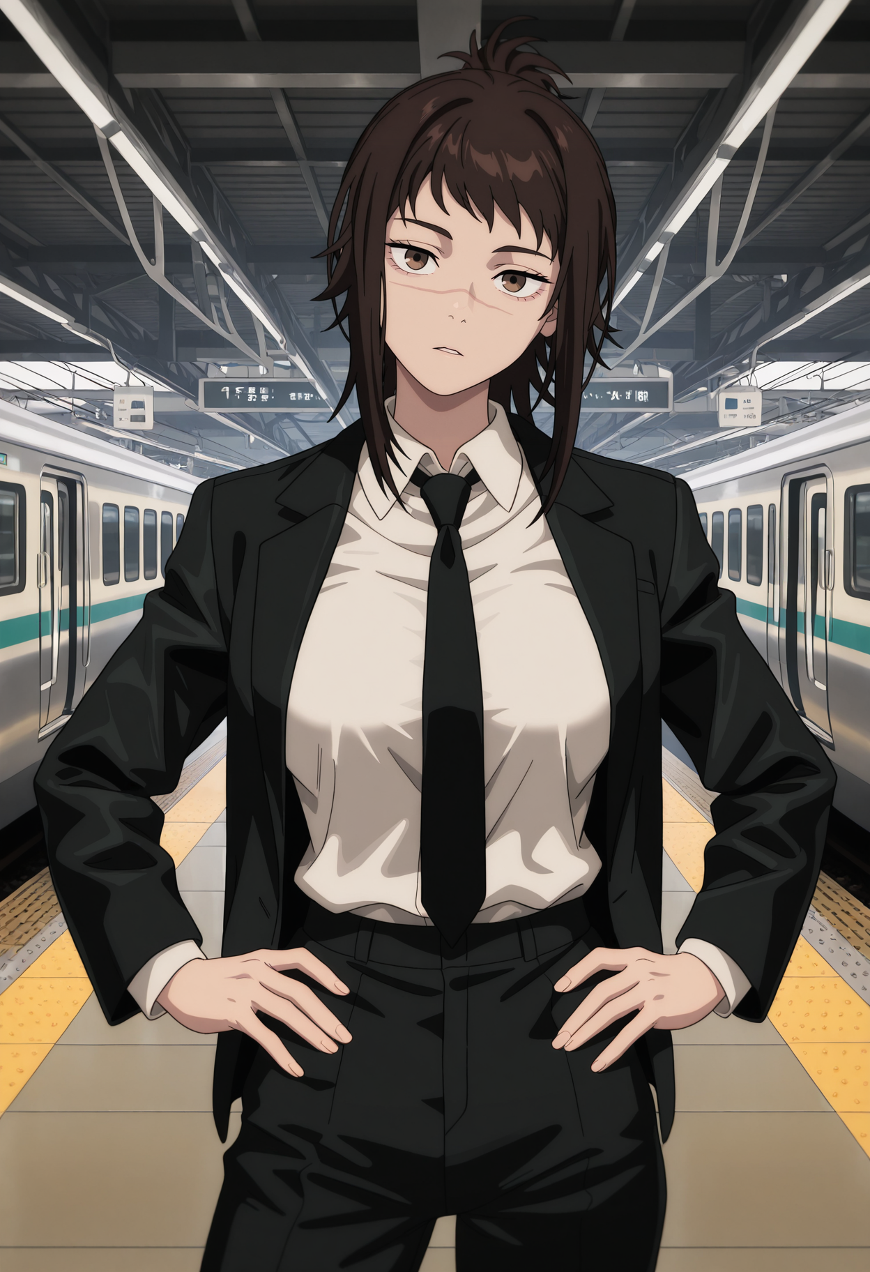 KJOmichiko, brown hair, brown eyes, scar on face, sidelocks, high ponytail,