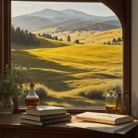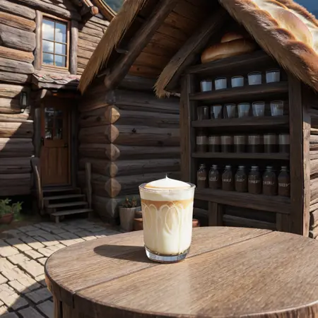 celestial, Donut, An enchanting bakery with a cottage-like atmosphere, evoking a sense of whimsy and charm, A foggy morning with mist hanging over the hills and valleysファンタジー_コーヒー用の例: