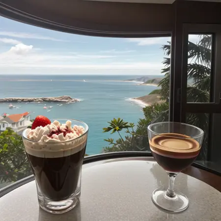 realism oil painting, Baroque, gin, end table, Surreal floating islands, waterfallsコーヒー_背景付き用の例: