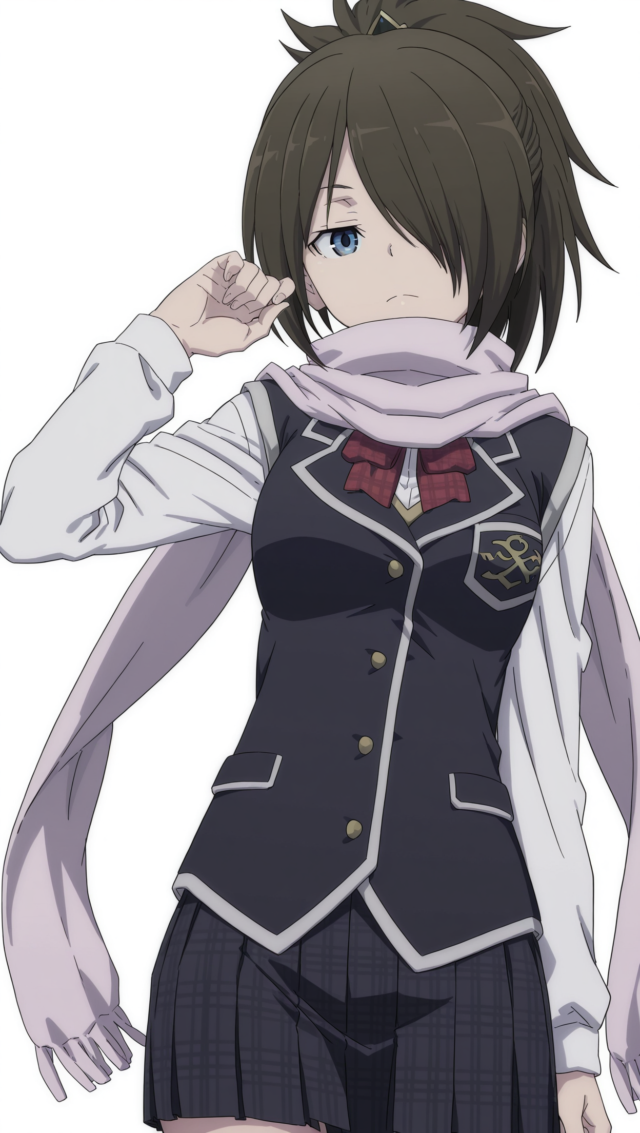 anime coloring, masterpiece, best quality, amazing quality, k4z4m4l3v1, 1girl, long hair, ponytail, brown hair, blue eyes, small breasts, hair over one eye, hair ornament, scarf, school uniform, blazer, black blazer, bowtie, red bowtie, shirt, white shirt, long sleeves, skirt, (red skirt:1.2), plaid skirt, socks, black socks, solo, pose, standing, looking at viewer, from front, ((((white background, simple background))))